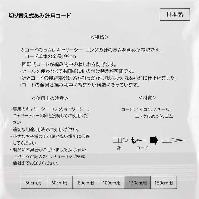※キャリーシー 切り替え式竹輪針(CCJA-09~11、CCJA-50~60)と接続可能ですが、全長はコードの表記サイズより5cm短くなります。