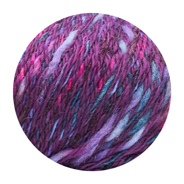 スラブ糸の太さの強弱が色の見え方にも表れ、編地も独特な立体感が出る、編んでいてとても楽しい毛糸です。