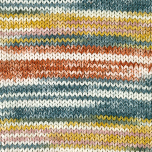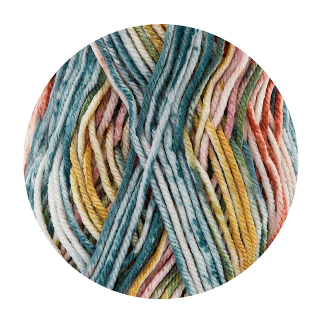 極太タイプのプリントヤーンがもたらす自然なグラデーションは、作品に深みと動きを加え、単色では表現できない奥行きを演出します。