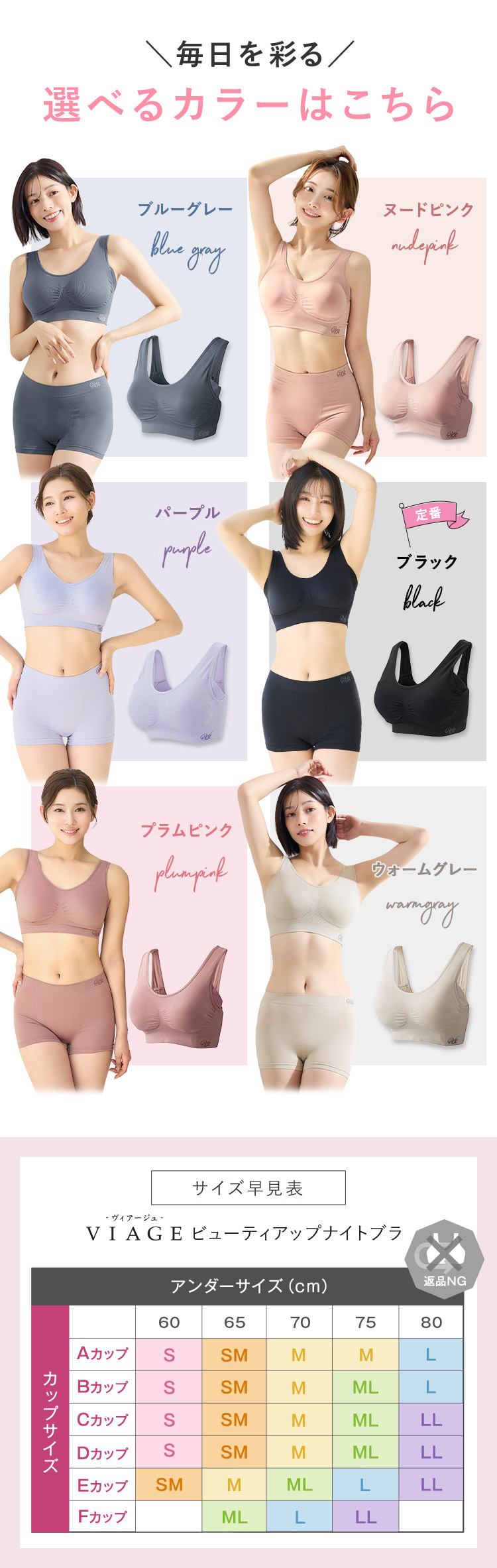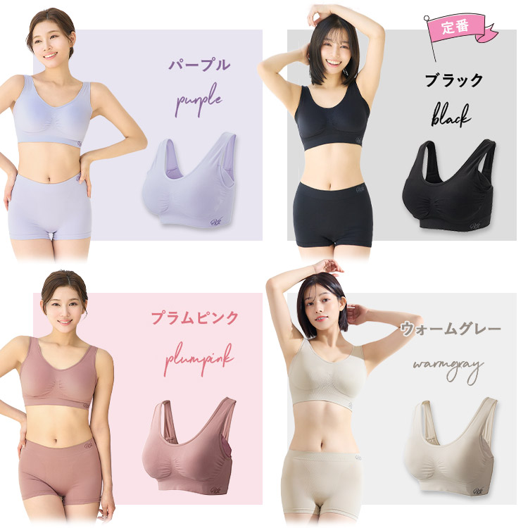ウォームグレー、ヌードピンク、パープル、ブラック、プラムピンク、ブルーグレー