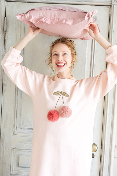 上質なニュアンスカラーのファーぼん天を使用した大人の為のルームウェア。遊びゴコロがたまらない!上質な毛並みのフェイクファーをチェリーに見立てた一着です。