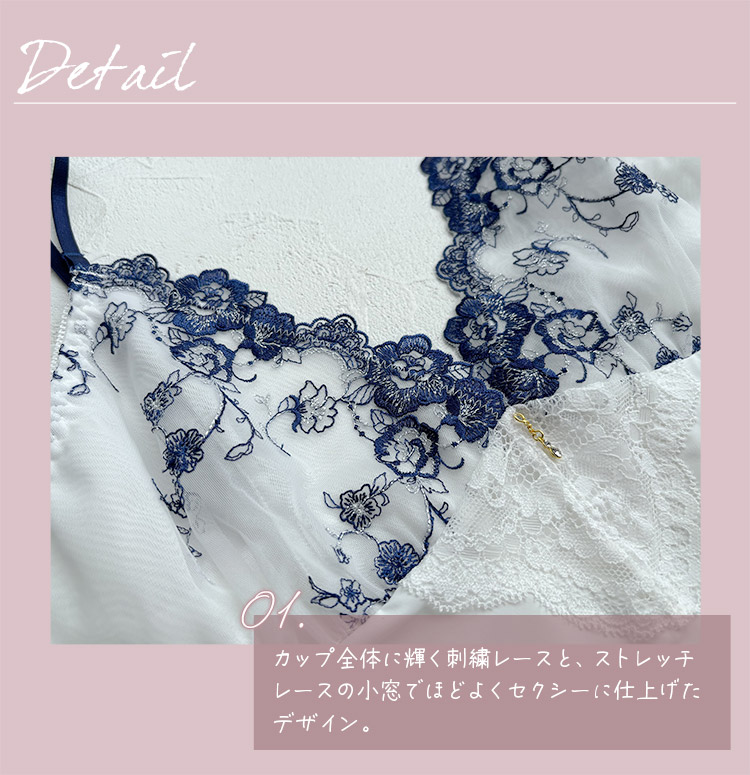 カップ全体に輝く刺繍レースと、ストレッチレースの小窓でほどよくセクシーに仕上げたデザイン。
