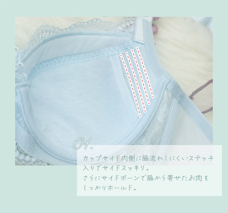 Cカップは厚手のわたでボリュームUPと上辺の浮きを防止、D~Gカップは薄手のわたですっきり。脇流れ防止の千鳥ステッチ入り。