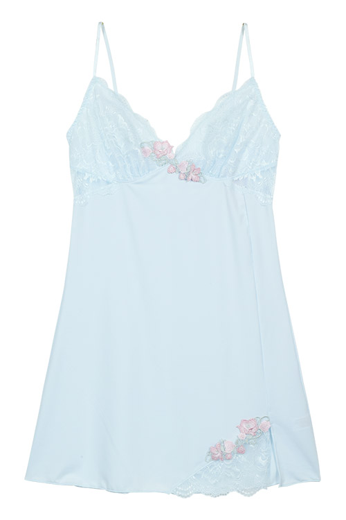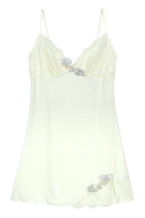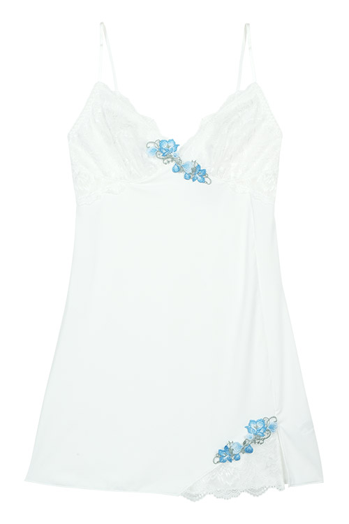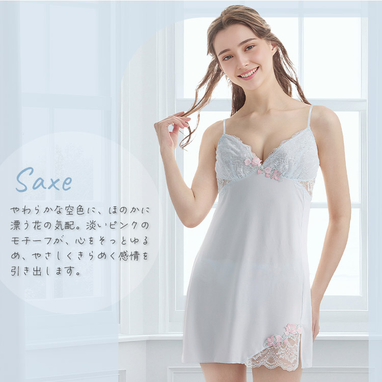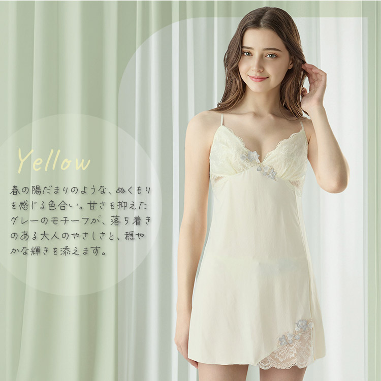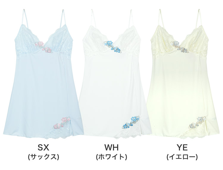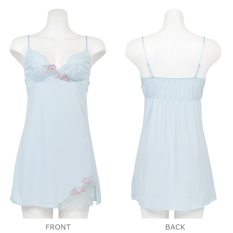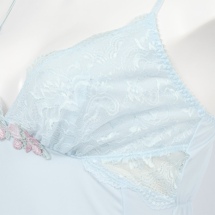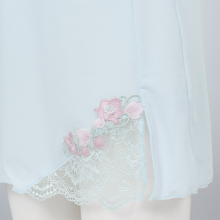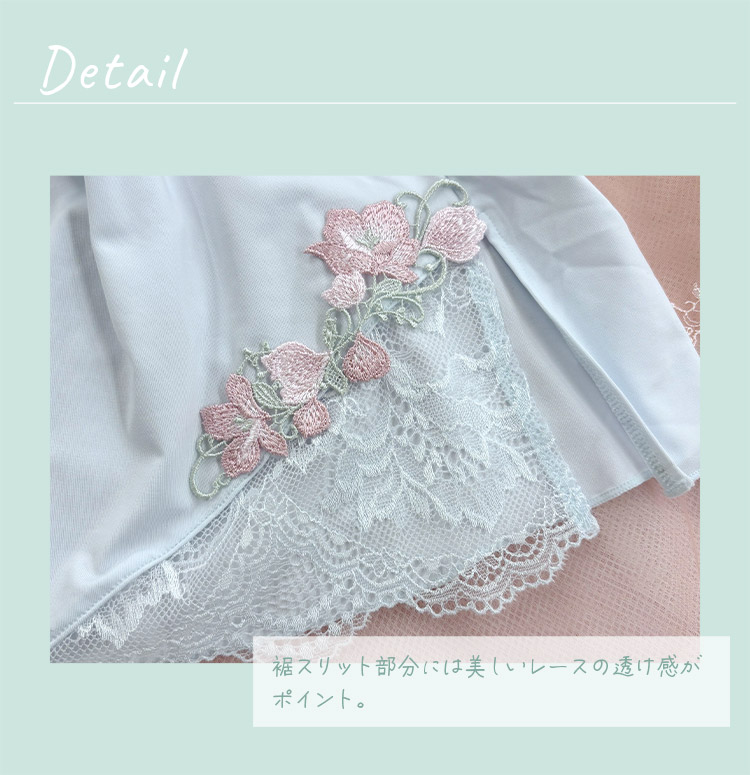 カップ下サイドと裾スリット部分には美しいレースの透け感がポイント。