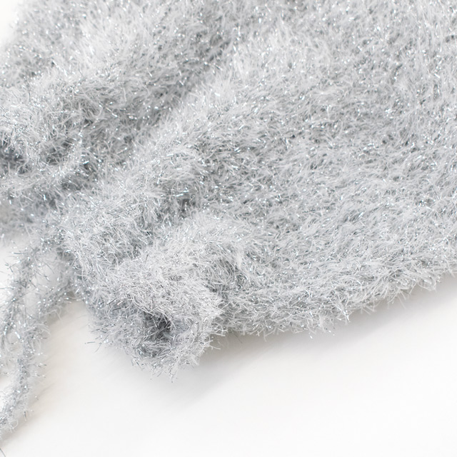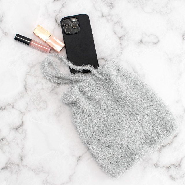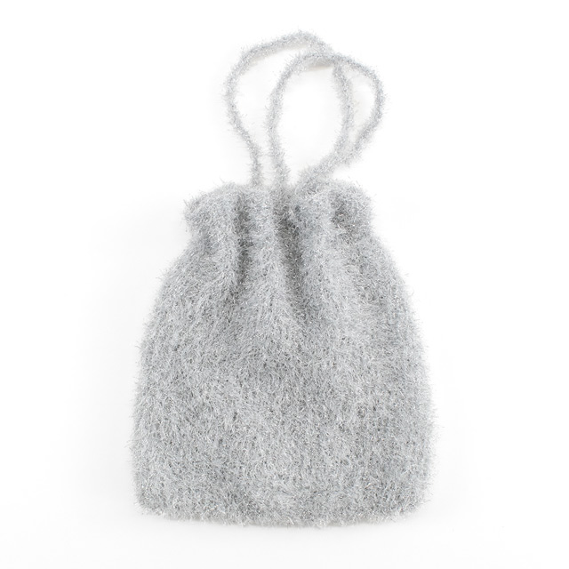 やわらかい煌めきとフワフワの質感で、ファッションのポイントにもなる巾着型ミニバッグです。スマホやメイクアイテムなどを入れてちょっとしたお出かけに重宝します。輪針を使って編むので初心者さんには少しハードルが高く感じるかもしれませんが、ぐるっと輪で編むことにより裏編みをせずに表編みだけでさくさく進められます。ファーの糸は目が編み針から落ちやすいので、気を付けながら編み進めましょう。