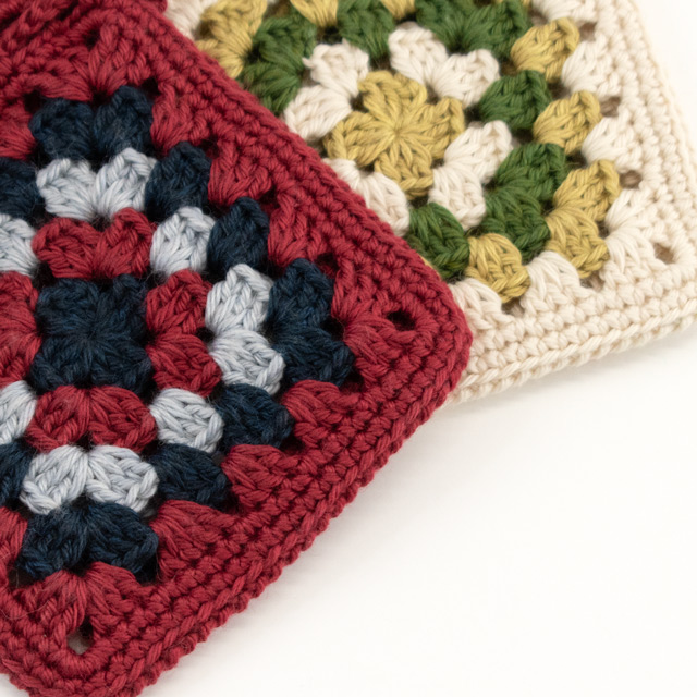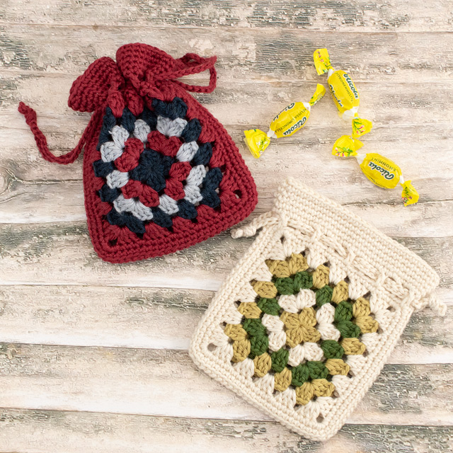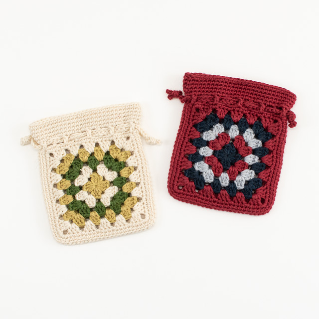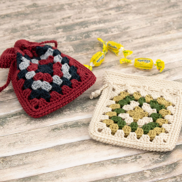 飴や小物入れに便利なミニ巾着。繰り返しの編み方で四角形を作る「グラニーモチーフ」を小さな巾着に仕立てます。はじめてグラニーモチーフを編んでみたい!という方におすすめ。パステルカラーやPOPな色合いの毛糸で編んでも可愛いです。