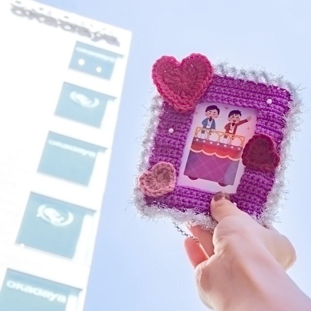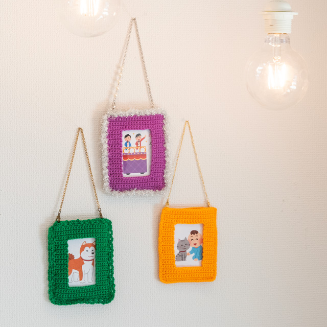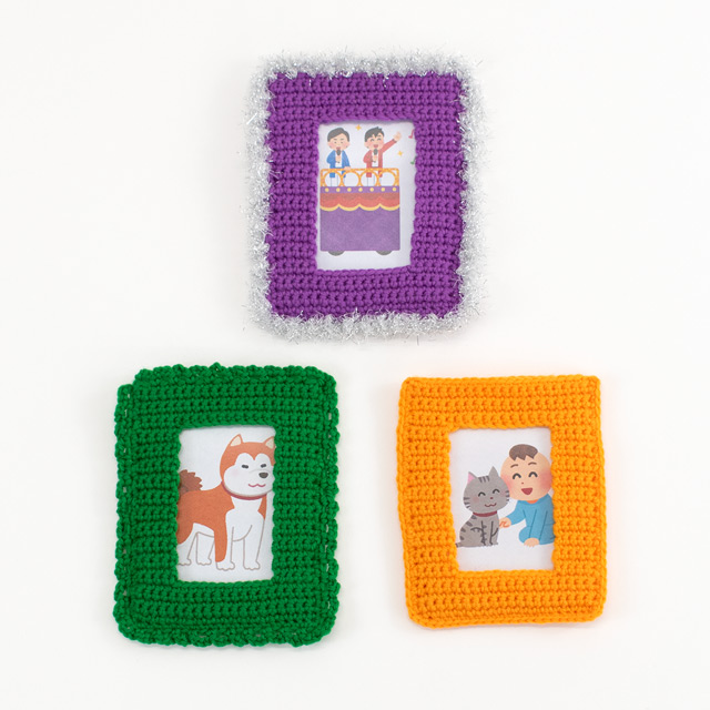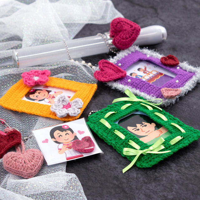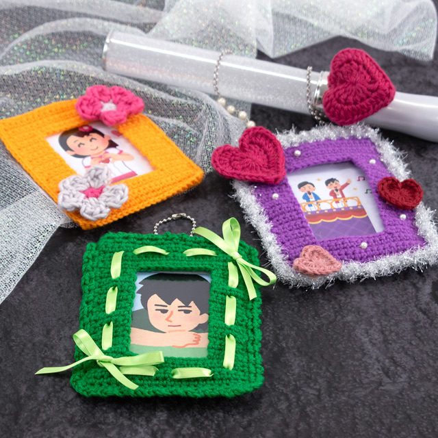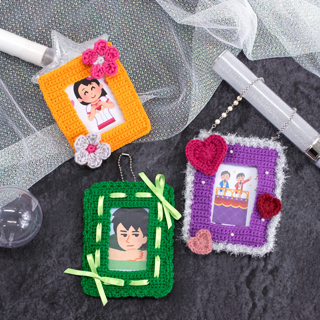 B8サイズの硬質カードケースを入れて使う、トレカケース。推しのトレカや写真を入れたら、推しといつでも一緒!お気に入りの場所で一緒に記念撮影も♡ペットやご家族などの写真を入れて持ち歩いたり、お部屋に飾っても!かぎ針編みが初めての方にもチャレンジしやすい作品です。お好みでアレンジしやすいようにシンプルな形にしています。ふちにフリルをつけたり、リボンやパーツでデコレーションしたり、いろいろアレンジして楽しんでくださいね。