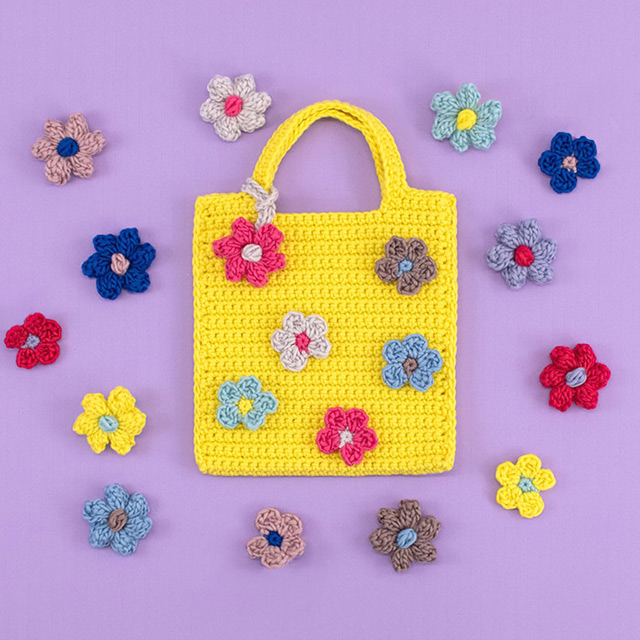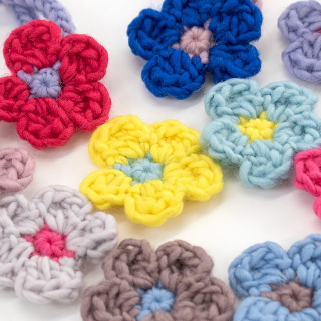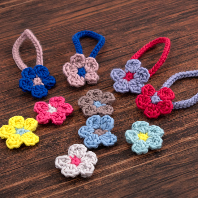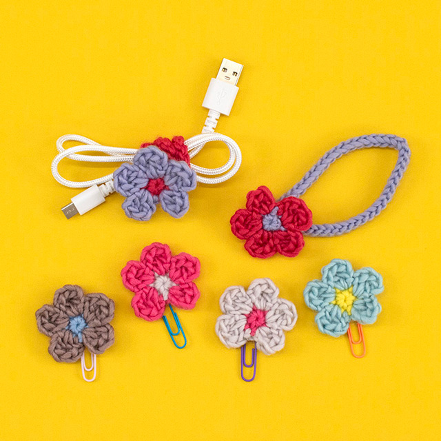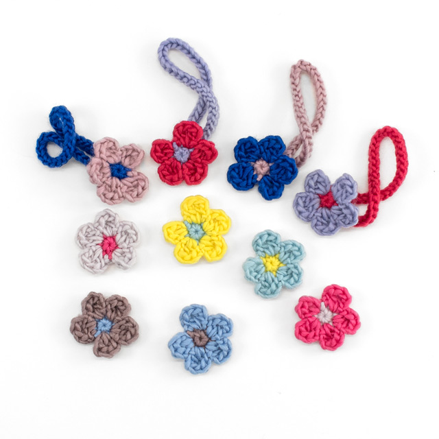 長編みやくさり編みなどの基本的な編み方で作る平らなお花のモチーフ。クリップにつけたり、コードを付けてコードホルダーにしても。まるでカラフルなお花畑みたいに、たくさん作って楽しんで!