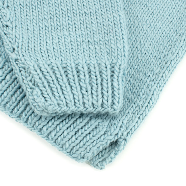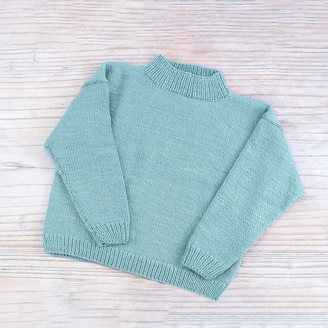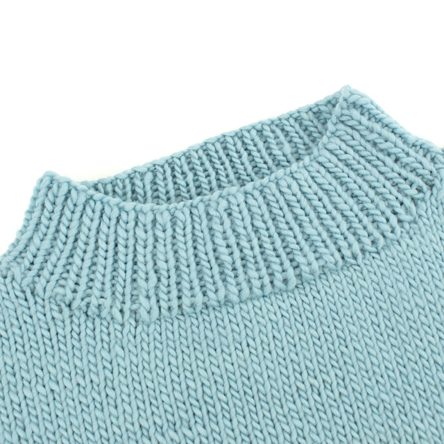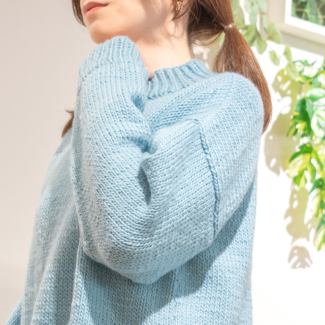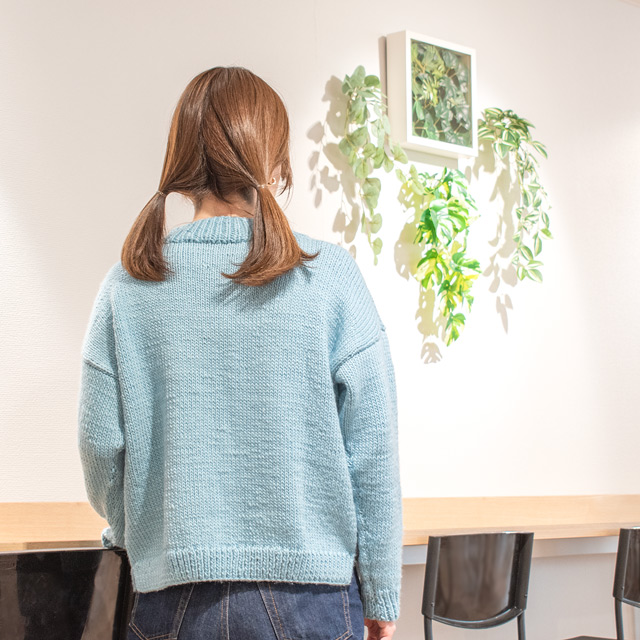 毛糸の風合いが活きる、シンプルなメリヤス編みのセーターです。パンツでもスカートでも合わせやすい着丈で、いろいろなコーディネートが楽しめます。極太のフラッフィーロービングはザクザクと編み進めることができ、とじはぎの際も編み目がわかりやすいので、初めてウェアを編む方におすすめです。