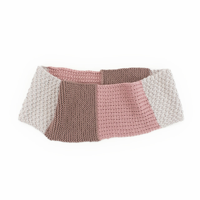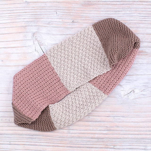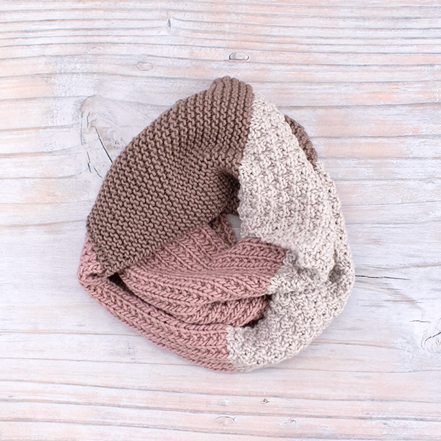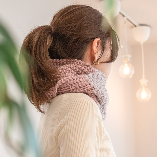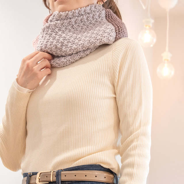 3色の糸で編む、地模様がかわいいスヌードです。かわいい色合いでボリューム感のあるデザインは、暗くなりがちな秋冬ファッションのポイントにもなります。一見凝ったように見える模様ですが、表編みと裏編みだけを組み合わせて編んでいるので意外と簡単。色変えしたり、単色編んでも素敵です。ぜひチャレンジしてみてください。
