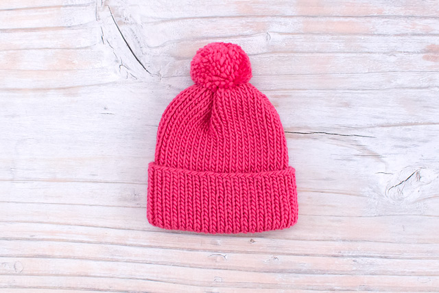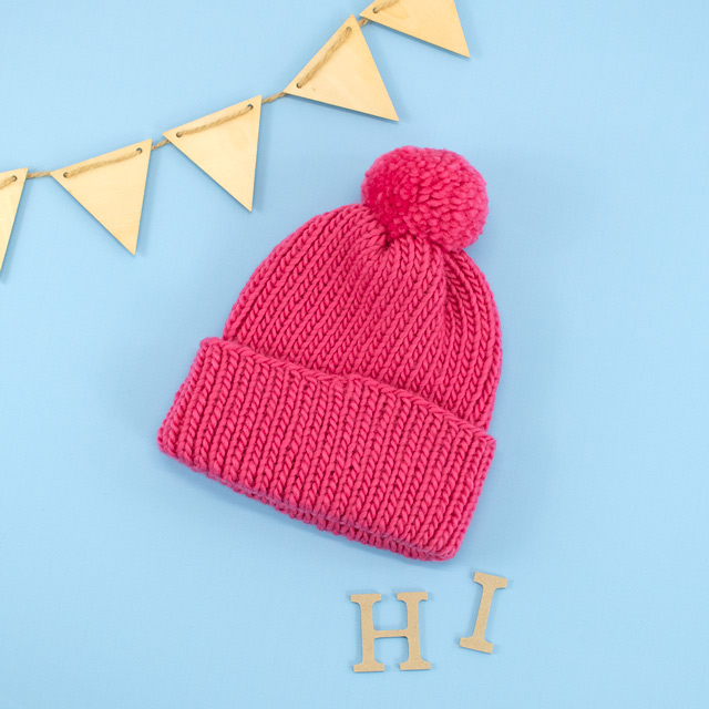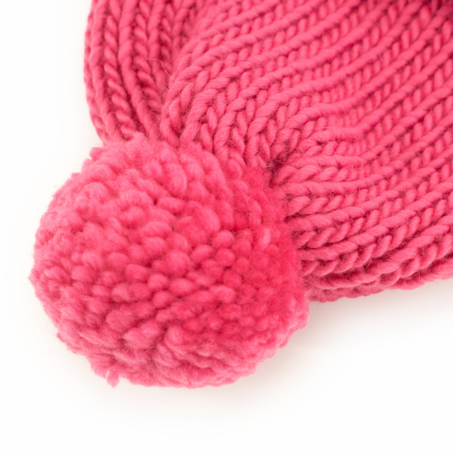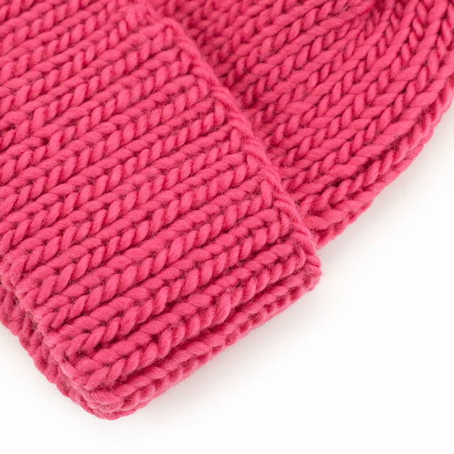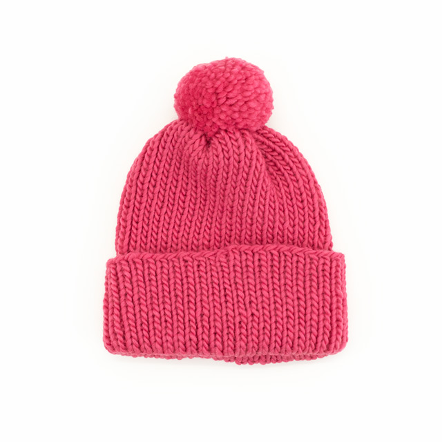 冬のお出かけにぴったりなキッズ帽子。大きめポンポンがアクセントになって、かぶるだけで元気いっぱいの印象に!幅広の折り返しもかわいいです。パステルやビビッドなど明るいカラー展開のフラッフィーロービングを使用しているので、ぜひお子様の好きなカラーで編んでみてください。