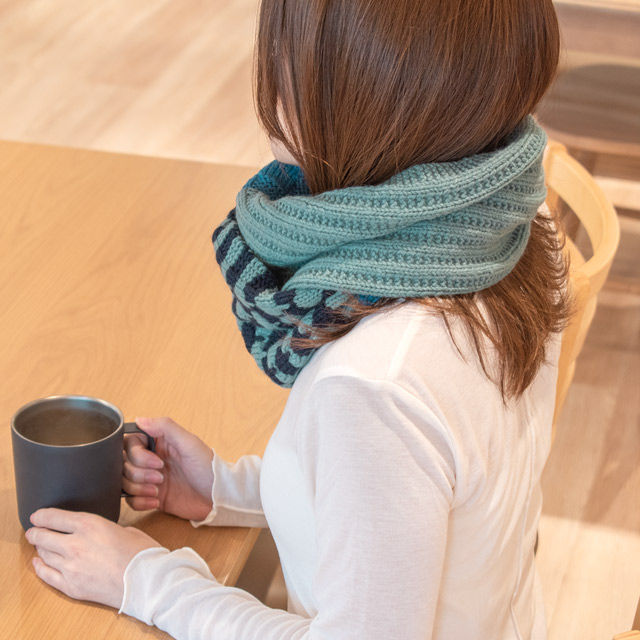 3色の糸を使い、3つの柄パターンが表現されたユニークなスヌードです。シンプルなファッションのポイントにもなります。地模様と引き上げ模様を組み合わせて編んでいくスヌード。引き上げ模様は色を変えることによって立体感が生まれます。様々な色の組み合わせが楽しめる作品です。