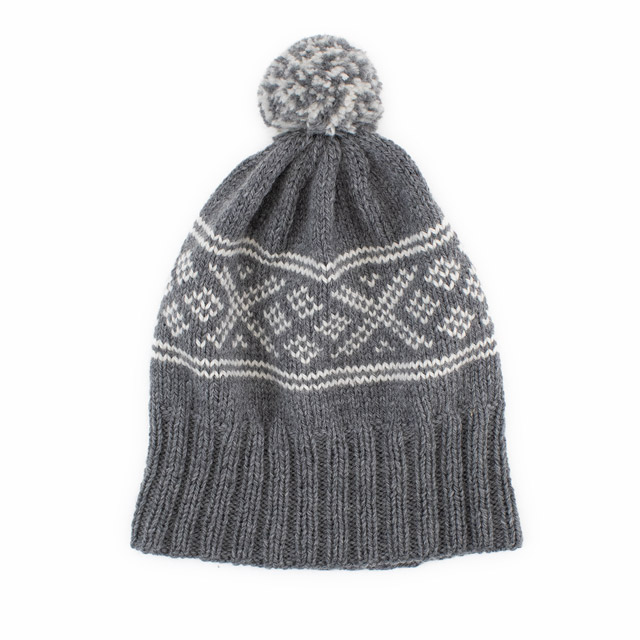 ダイヤやクロスの柄を編み込んだニット帽。ノルディック調の柄が、ノスタルジックで温かみのある雰囲気を演出します。一見難しそうな編み込み模様も、輪で編むことによって表面だけ見て編めるので、配色の糸替えがスムーズにできます。編み込みにチャレンジしてみたい!という方におすすめです。