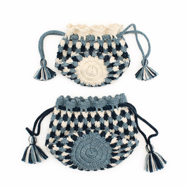 ころんとしたフォルムがかわいい、かぎ針編み巾着です。紐先のタッセルもデザインのポイントです。アクセサリーやメイクアイテム、飴などの小さな物はもちろん、ぬいぐるみやお人形を入れても!段ごとに色を替えているので少し複雑そうに見えますが、長編み、細編み、くさり編みの基本の編み方で編めるので、かぎ針はじめてさんでもチャレンジしやすい作品です。大小2サイズの編み図が記載されているので、ぜひサイズ違いで編んでみてください。