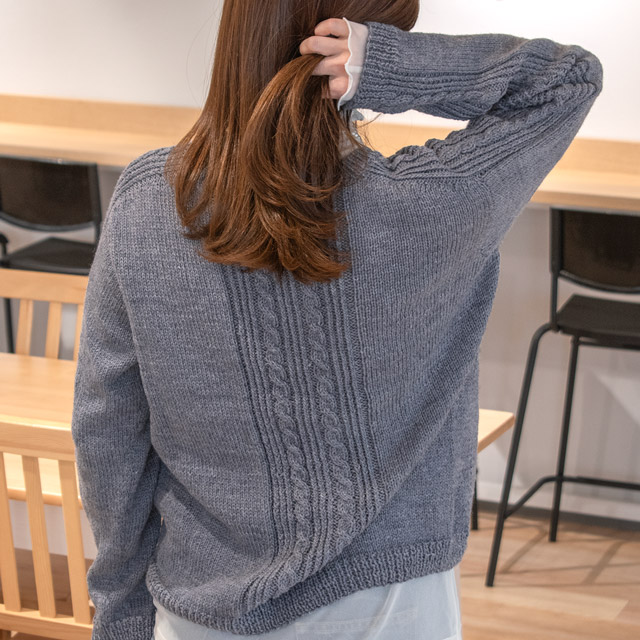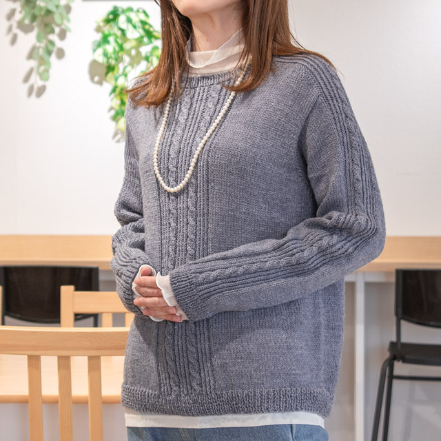 肩のラインがすっきり見えるエポーレットスリーブのセーターです。中心に入ったケーブル模様もおしゃれな印象です。縄編みで肩線まで続けて編むエポーレットスリーブは直線的ですっきりとしたフォルムで、ラグランスリーブとはまた違った印象に。