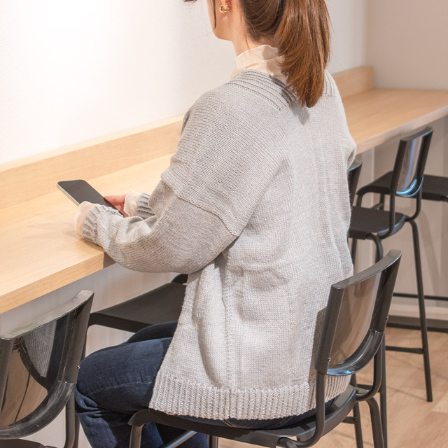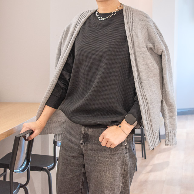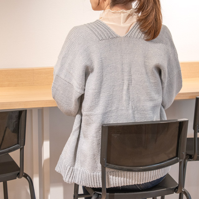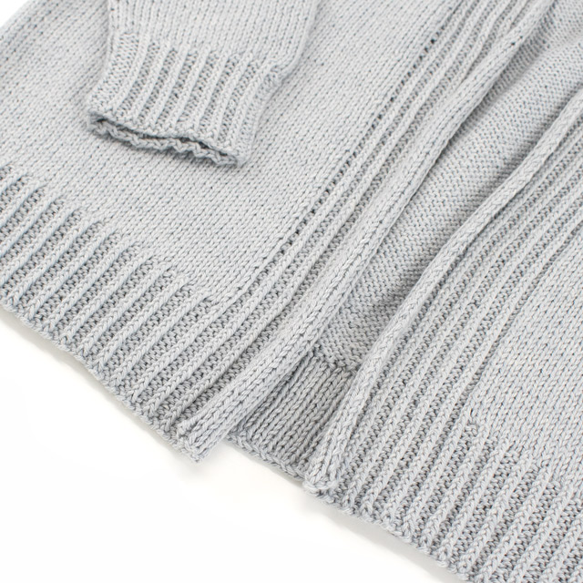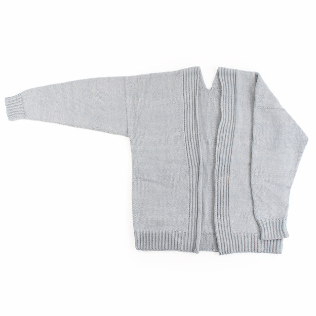 ボタンのないシンプルなデザインのカーディガン。すっきりとしたシルエットで、年齢を問わず着こなしやすいデザインです。後身頃から前身頃へと続けて編む、まっすぐ編みのデザイン。裾、袖口、前立てはねじりゴム編みできゅっとひきしめています。さらっとした肌触りのキャトルで編めば、オールシーズン着れる大活躍のカーディガンに仕上がります。