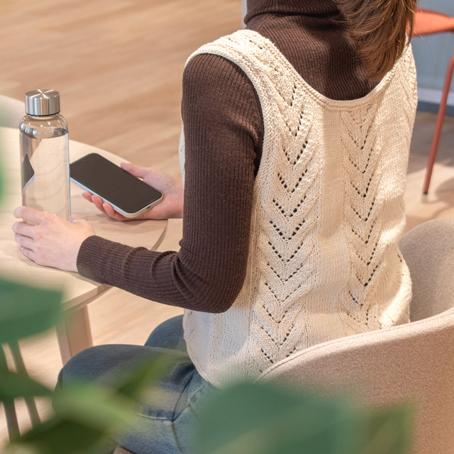 1枚でさらりと着たり、レイヤードスタイルを楽しむこともできる万能キャミソール。前は浅めのVネック、後は広めの衿ぐりと、雰囲気を変えて前後で着用できます。繰り返しの透かし模様はリズムよく編めて、仕上がりも軽やかに。