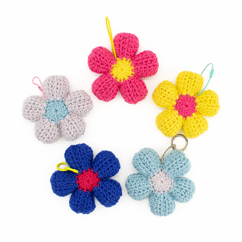 わたを詰めてぷっくり立体的に仕上げた、大きなお花のチャーム。バッグやスマホにつけると存在感抜群!細編みや長編みなどのかぎ針編みの基本的な編み方で編むので、かぎ針はじめてさんにもおすすめです。色の組み合わせも楽しんで編んでみてくださいね。