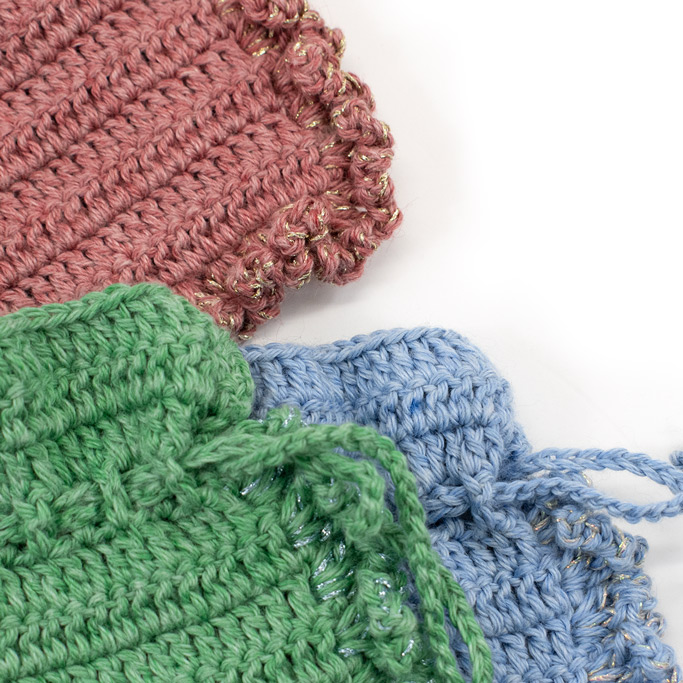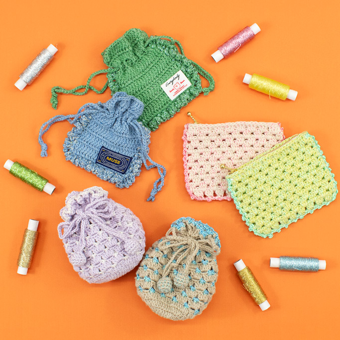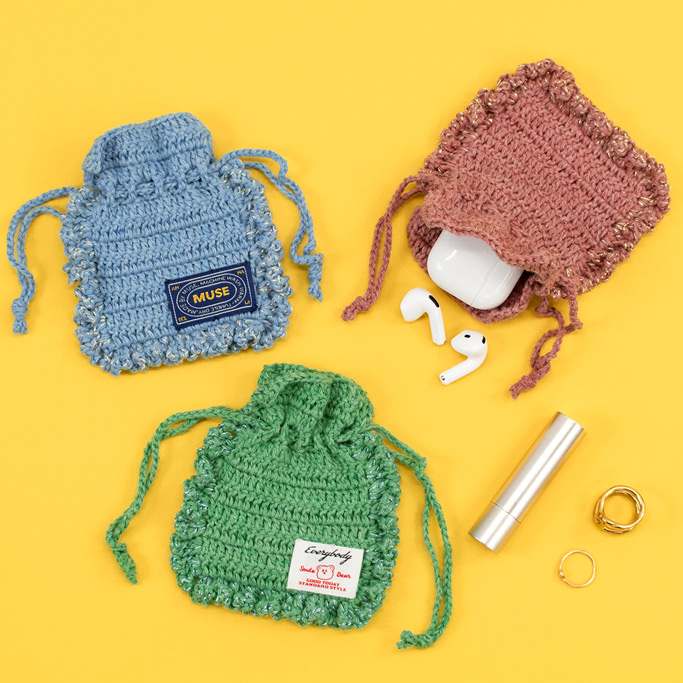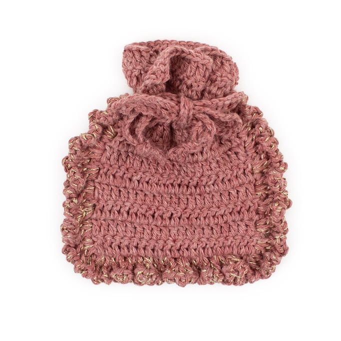 キラキラのフリルがかわいい、手の平サイズの小さなきんちゃくです。フリル部分にだけラメ糸を引き揃えキラキラ感を出しているのもポイント。長編みの本体を2枚編み、2枚の本体をとじながらフリルを編んで仕上げる簡単デザインなので、初めてかぎ針に挑戦したい方におすすめです。フリルをラメ糸のみで編んだり、お好みでタグをつけるのも◎。お気に入りの組み合わせで編んでみてくださいね。