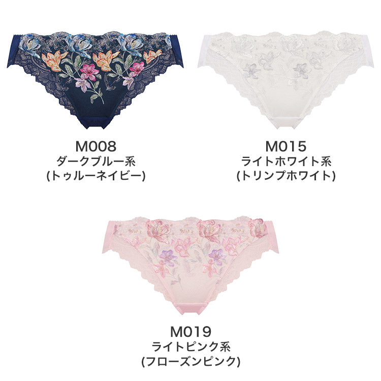 M008 ダークブルー系(トゥルーネイビー)、M015 ライトホワイト系(トリンプホワイト)、M019 ライトピンク系(フローズンピンク)