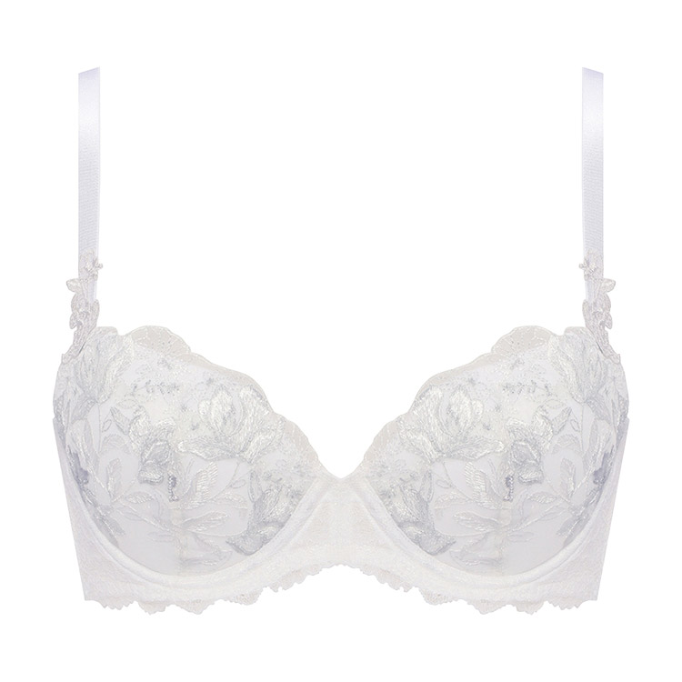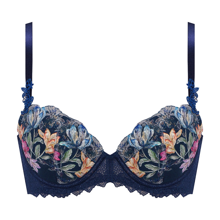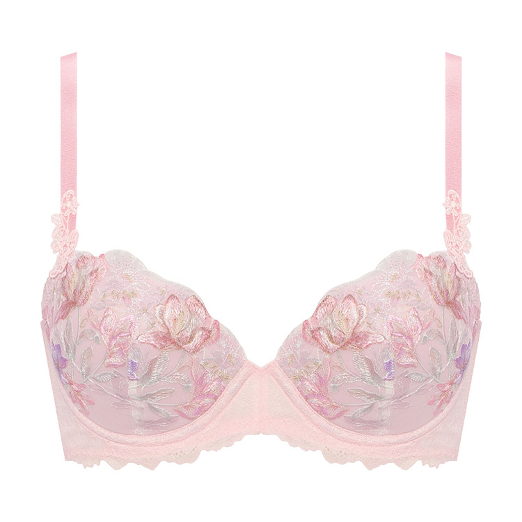 ロマンチックなプリントエンブレースをカップ部分にあしらい、フロントにはストレッチレースを使用。肩ひもの付け根にはモチーフを添えたプレミアム感あふれる華やかなデザインです。