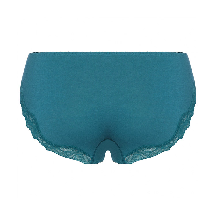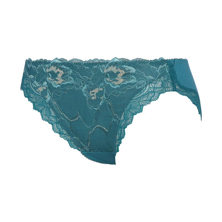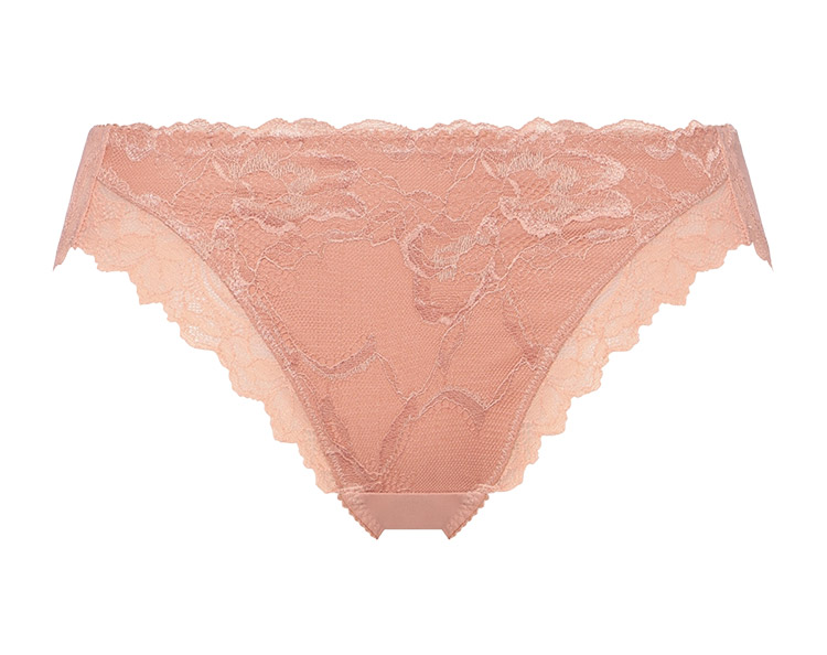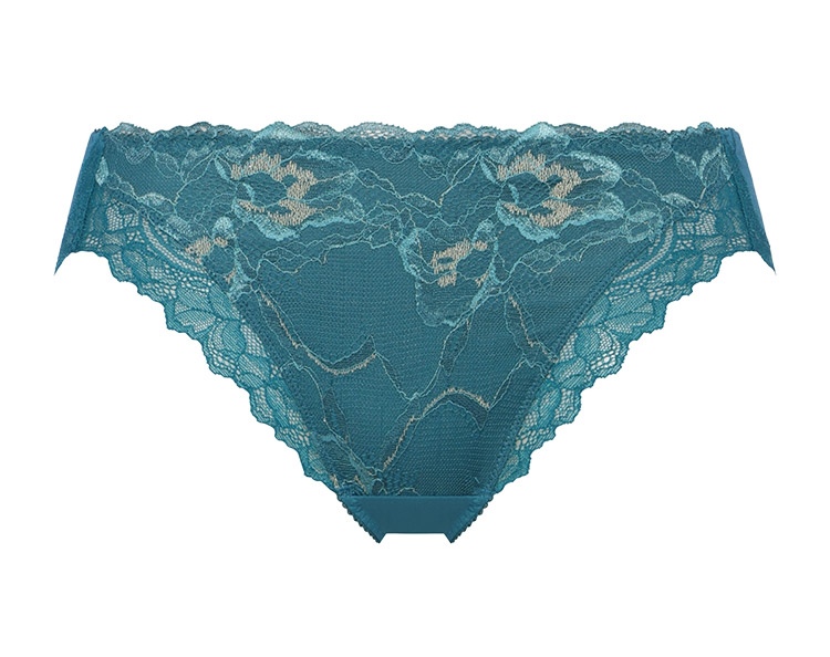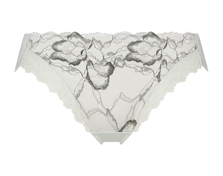 軽い印象のストレッチレースをフロントに、細いストレッチレースを脚口に使用した、フロントのはきこみが浅めのハイレグタイプのフィット感がある上品なプレミアムらしいデザインのショーツです。
