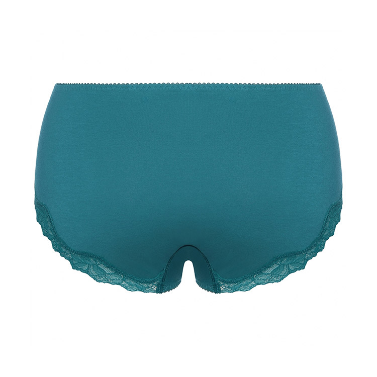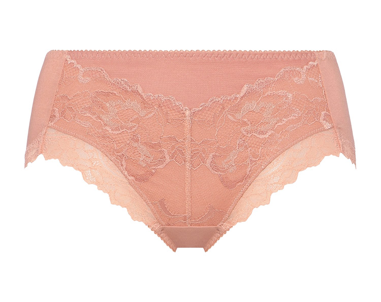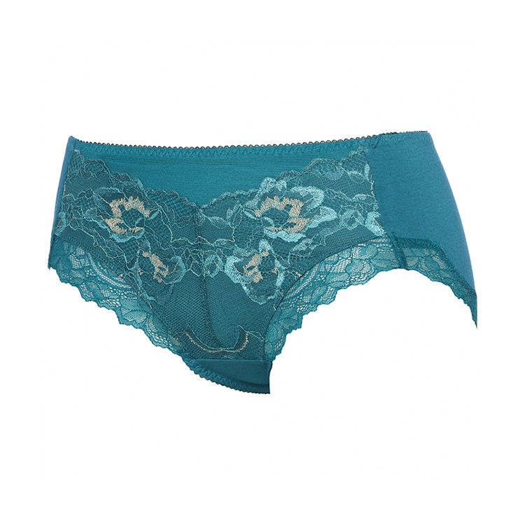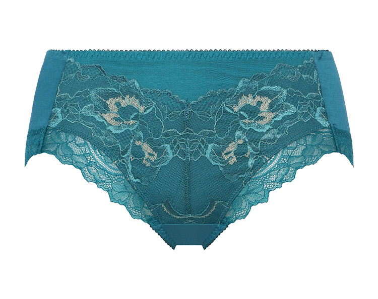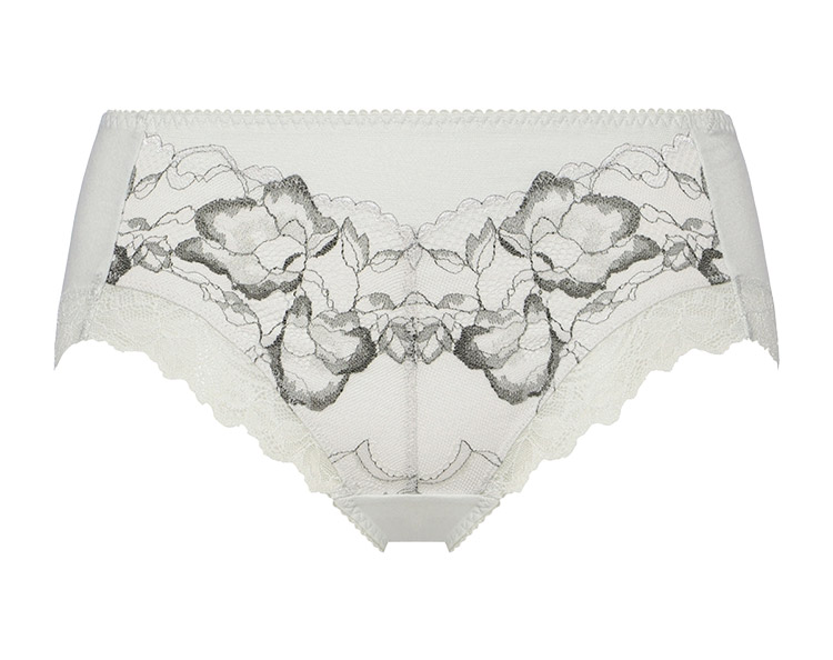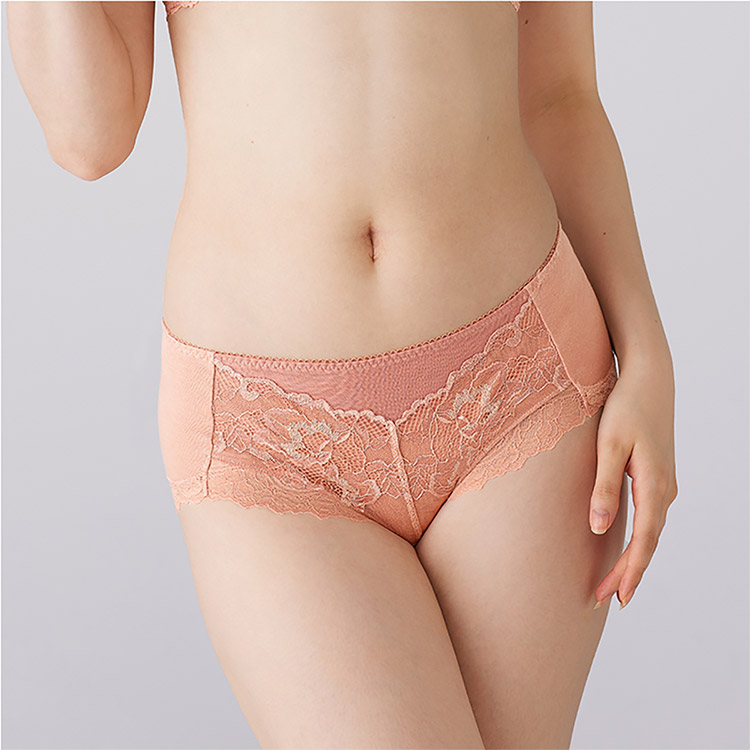 軽い印象のストレッチレースをフロントに、細いストレッチレースを脚口に使用した、はきこみ普通のショーツ。脚口は鼠径部に添ったスタイルの上品なプレミアムらしいデザインです。