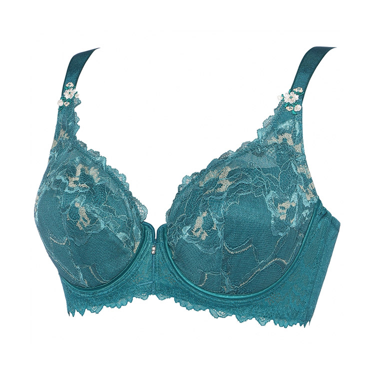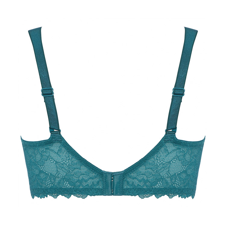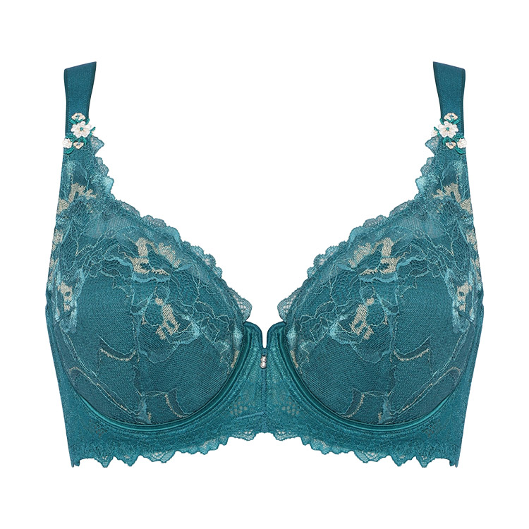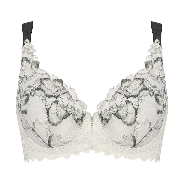 バストを包みこむカップと背中にストレッチレースを使用し、ストラップの付け根にモチーフを使用したプレミアムらしい上品なデザインです。