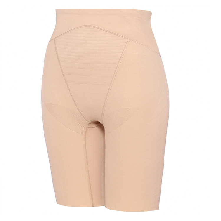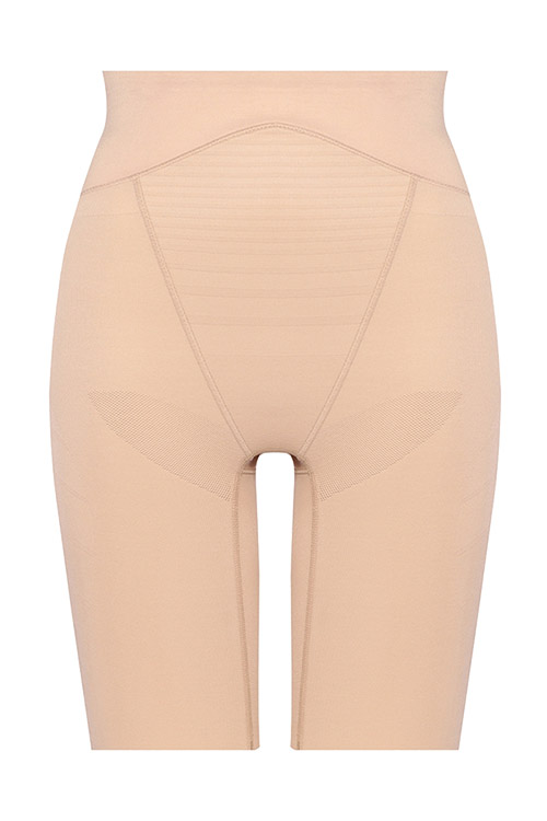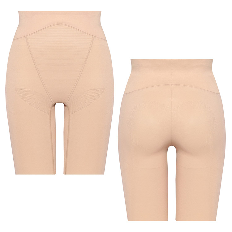 身生地は一枚の編地で編み方をかえてパワー差をつけているので、おなか、内もも、外ももヒップをサポートし、すっきりみせます。