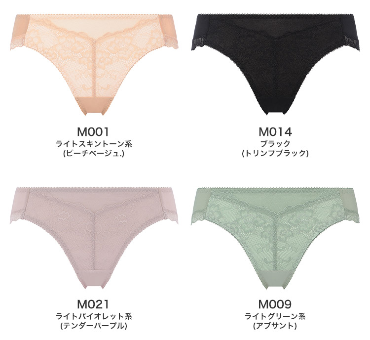 M001 ライトスキントーン(ピーチベージュ)、M009 ライトグリーン系(アブサント)、M014 ブラック(トリンプブラック)、M021 ライトバイオレット系(テンダーパープル)