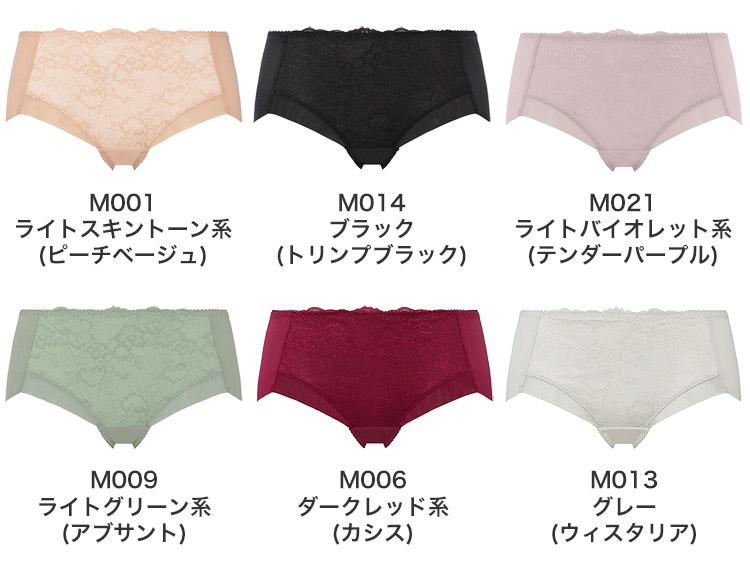 M001 ライトスキントーン(ピーチベージュ)、M009 ライトグリーン系(アブサント)、M014 ブラック(トリンプブラック)、M021 ライトバイオレット系(テンダーパープル)、M006 ダークレッド系(カシス)、M013 グレー(ウィスタリア)