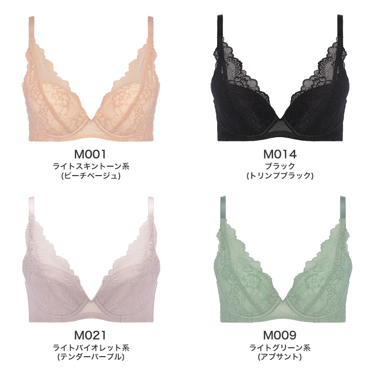 M001 ライトスキントーン(ピーチベージュ)、M009 ライトグリーン系(アブサント)、M014 ブラック(トリンプブラック)、M021 ライトバイオレット系(テンダーパープル)