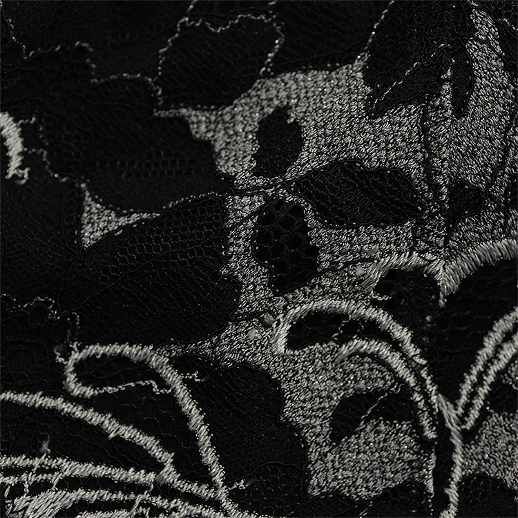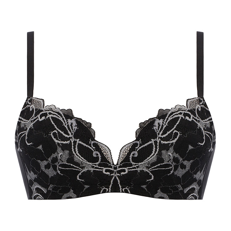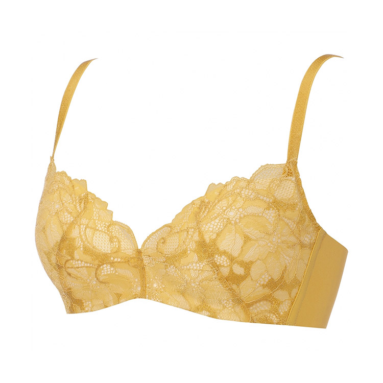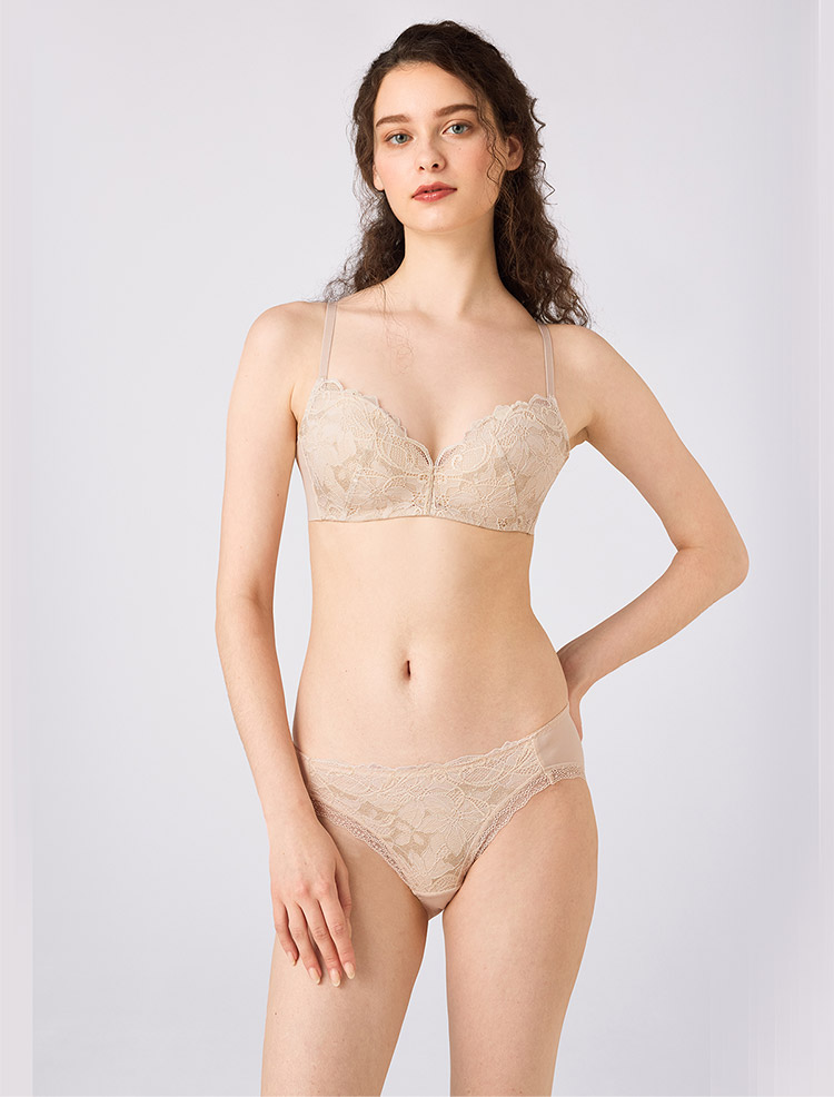 クレマチスの花をモチーフにした編みレースをバスト部分に使用したノンワイヤーだけどきれいなバストシルエットに見えるデザインのブラジャーです。
