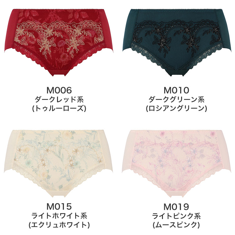 M006 ダークレッド系(トゥルーローズ)、M010 ダークグリーン系(ロシアングリーン)、M015 ライトホワイト系(エクリュホワイト)、M019 ライトピンク系(ムースピンク)