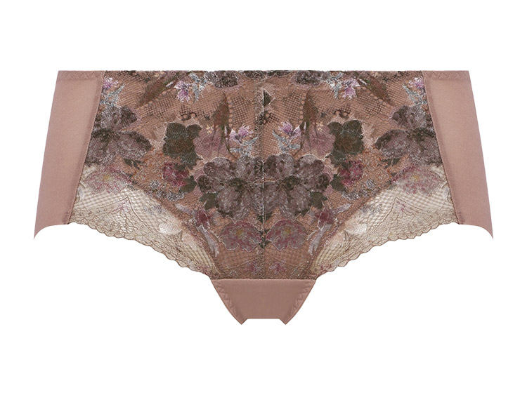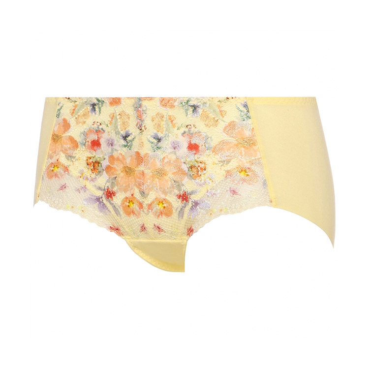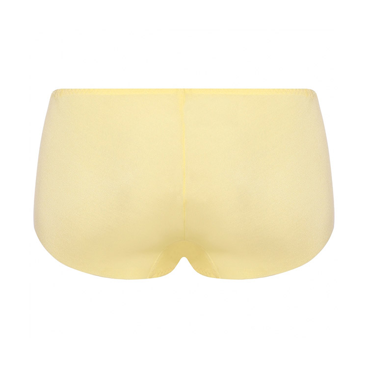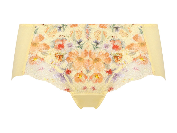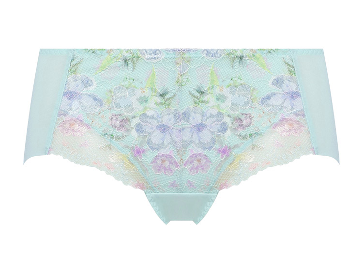 はきこみは浅く、脚口はフロントがレース、後ろは一枚仕立て、ヒップハンガータイプのショーツです。