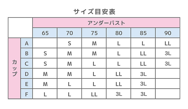 S(トップバストサイズ72-80cm)、M(トップバストサイズ79-87cm)、L(トップバストサイズ86-94cm)、LL(トップバストサイズ93-101cm)、3L(トップバストサイズ100-108cm)