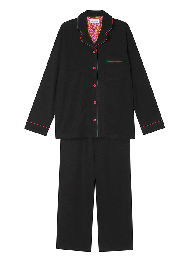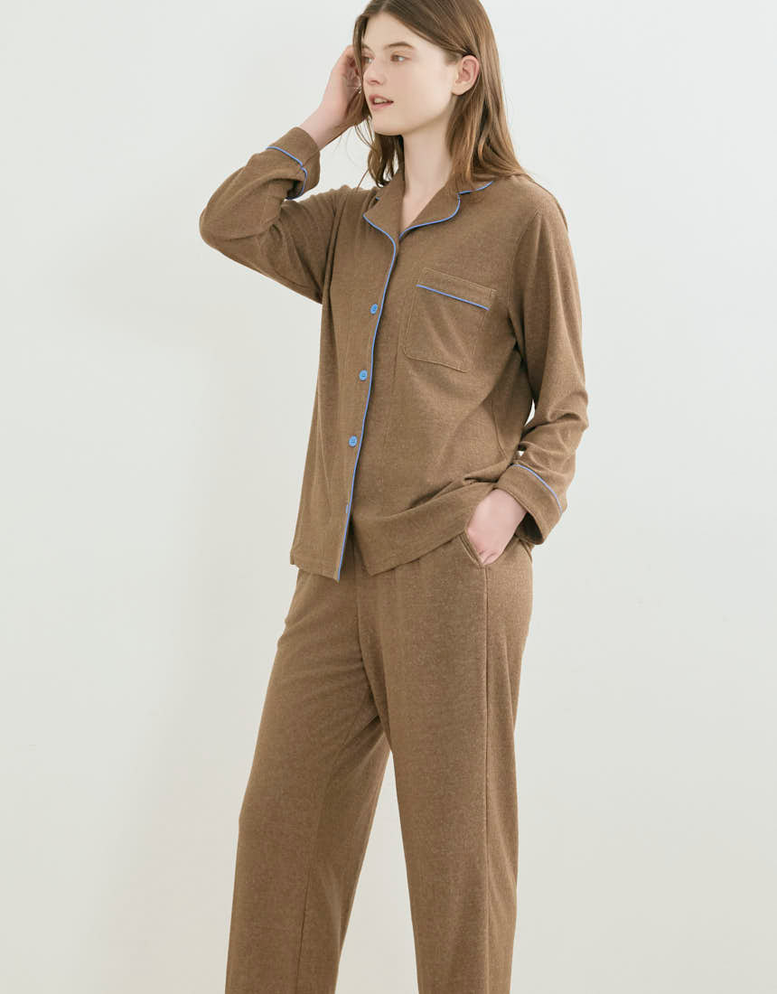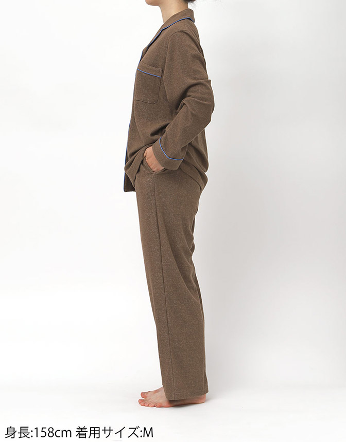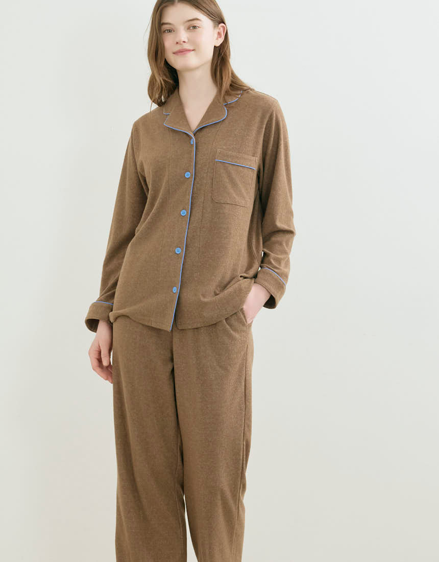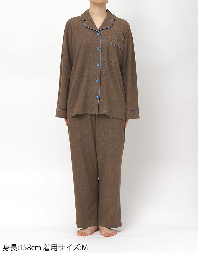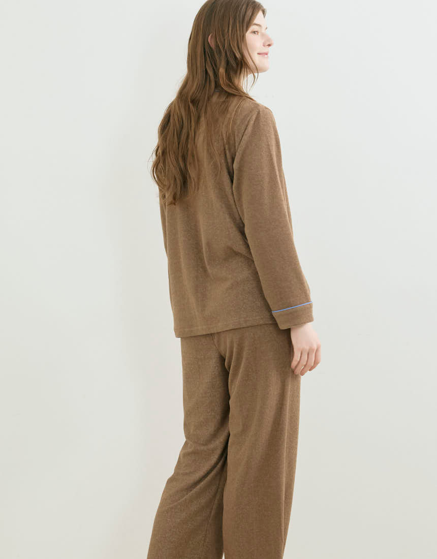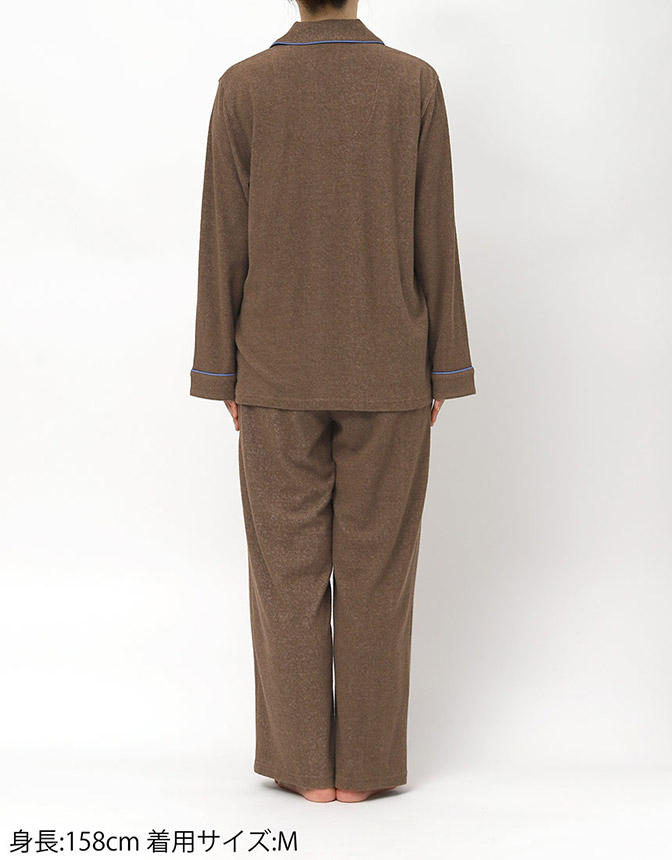 ふんわりとやわらかな綿混のパイル生地を使用した開襟シャツの長袖パジャマ。