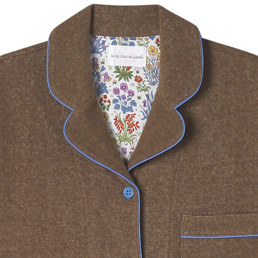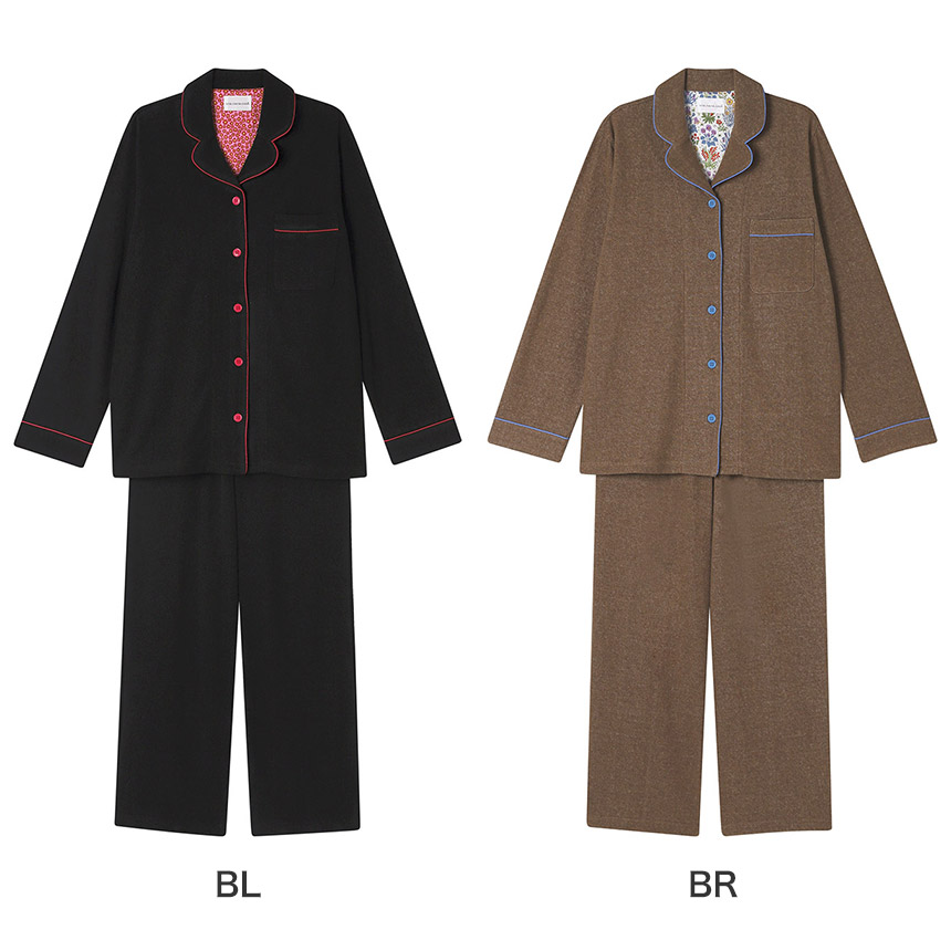 ふわふわと気持ちの良い肌触りが魅力的なパイルのパジャマの背当てに、リバティプリントの生地をあしらいました。