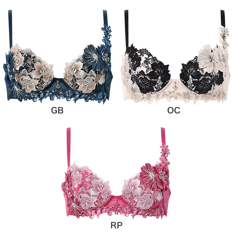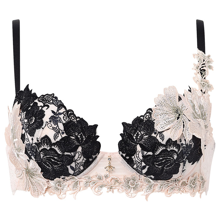 はっきりとした輪郭で表現された花々と、芍薬の花をイメージしたアップリケがゴージャス。ドラマティックなカラーリングが魅力を引き立たせます。花びらの上にあしらわれたクリスタルと、前中心で優雅に揺れるチャームの輝きがアクセント。ストラップ片側と土台下辺には艶やかなケミカルアップリケをほどこし、洗練されたデザインに仕上げました。