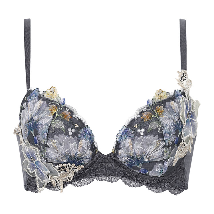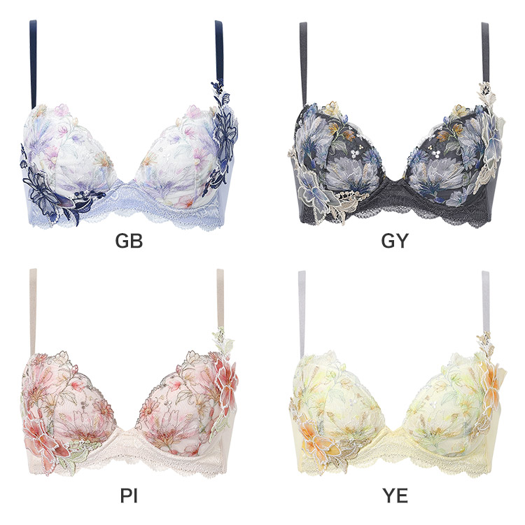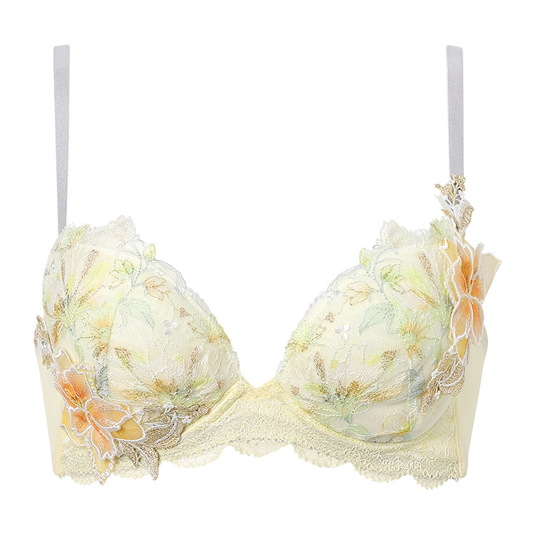 カップレースには繊細に輝くラメ糸を散りばめ、カップサイドに大きなアップリケを大胆にあしらったデザイン。アップリケは透け感があり、軽やかで春らしい印象です。バックにさりげなくほどこされたアップリケがアクセントに。高造形タイプで、「バストが広がって見えるのが気になる」「しっかり高さのあるメリハリバストが好み」という方におすすめです。