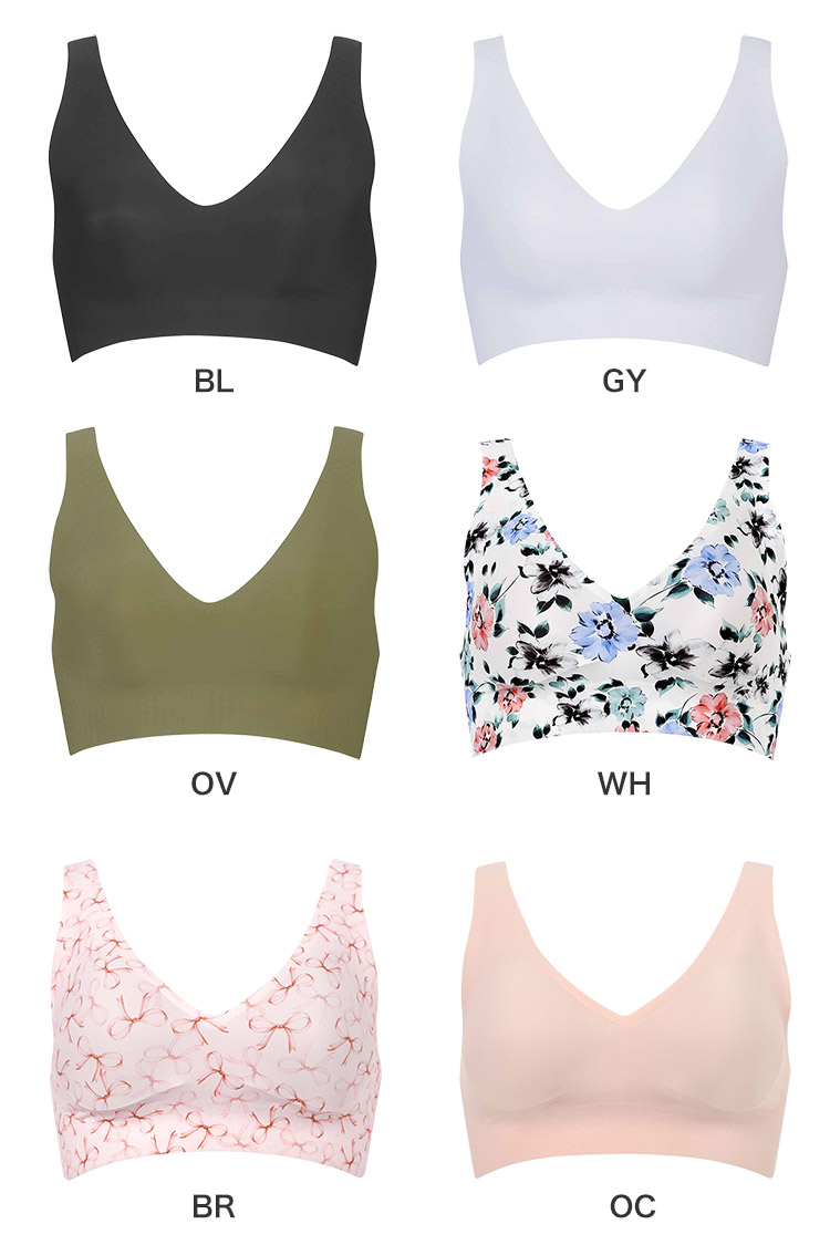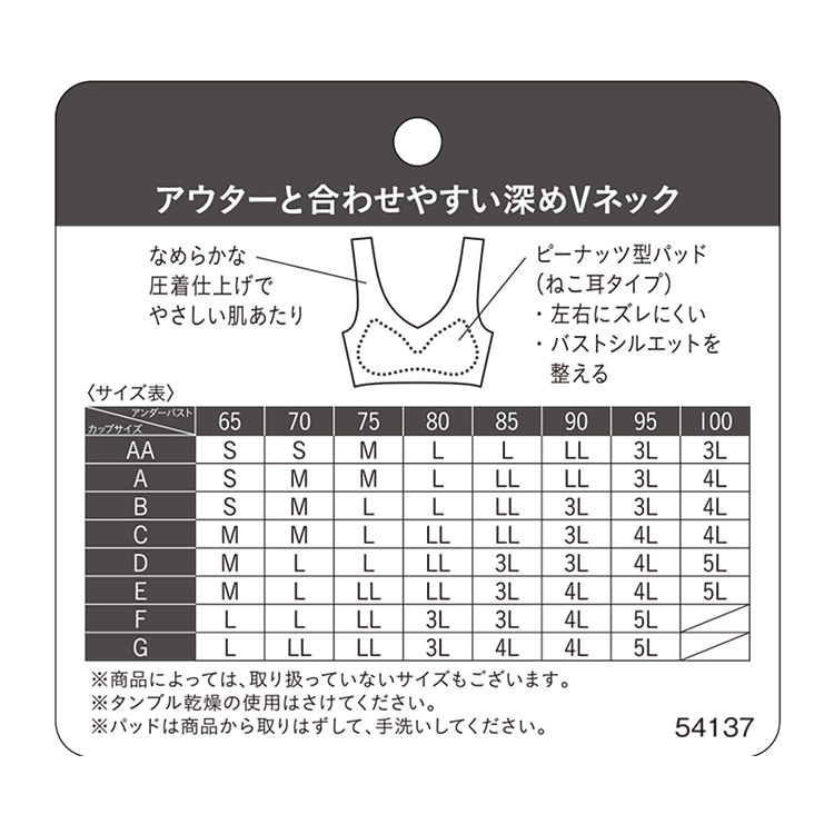 立体感と厚みのある左右一体型のピーナッツ型パッド(ねこ耳タイプ)内蔵(取りはずし可能)で、上向きで立体的なバストシルエットでありながら、バストトップ間隔が離れず位置が安定。パッドの上辺が上胸に沿いやすいラインで、横胸のシルエットがきれい