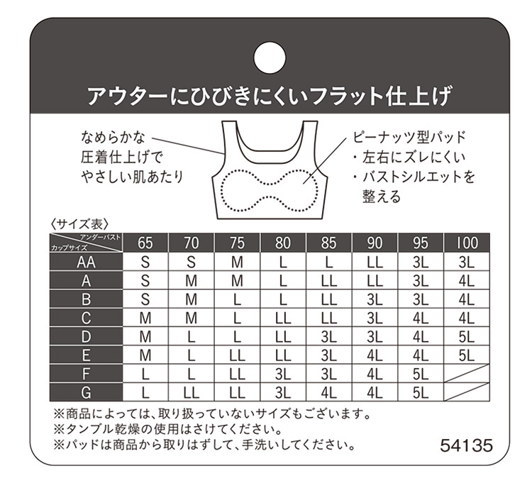 S(バスト72-80cm)、M(バスト79-87cm)、L(バスト86-94cm)、LL(バスト93-101cm)