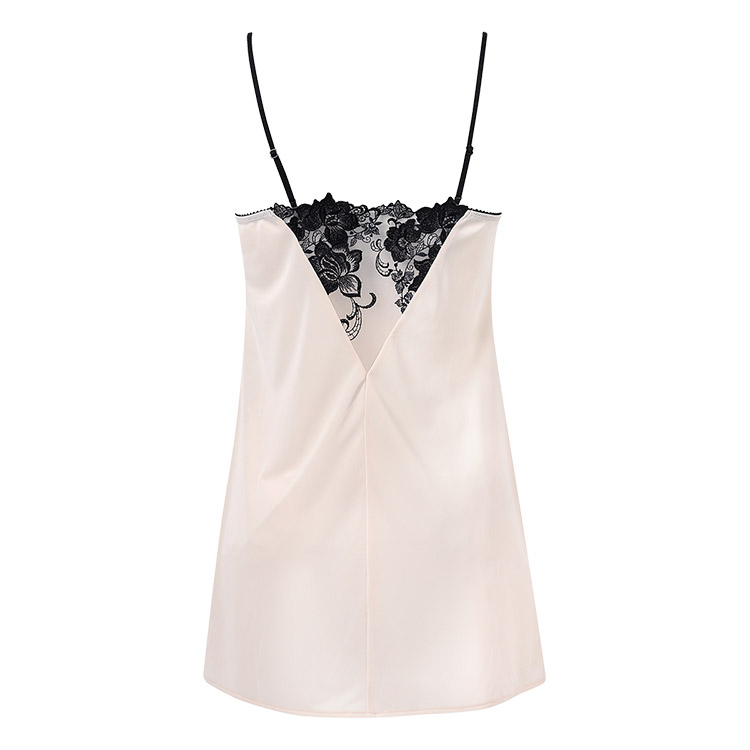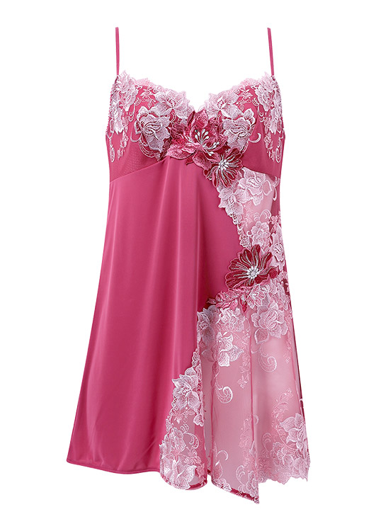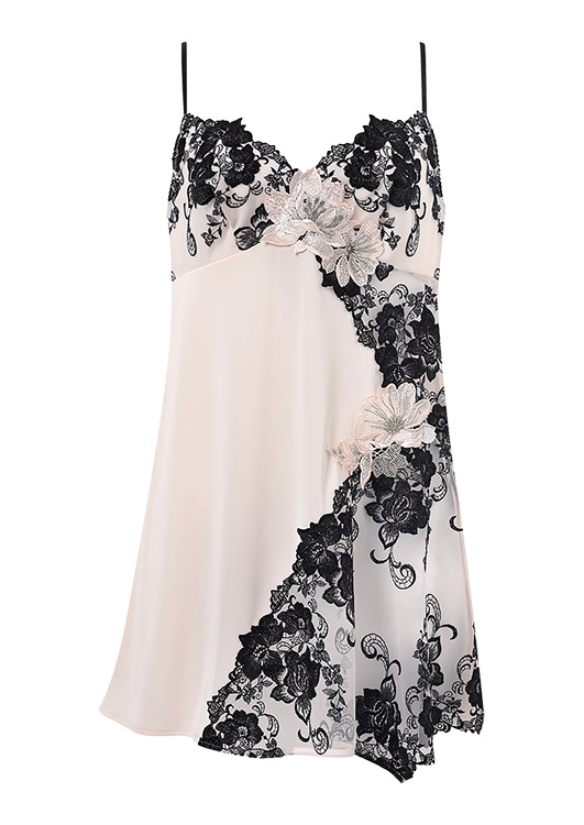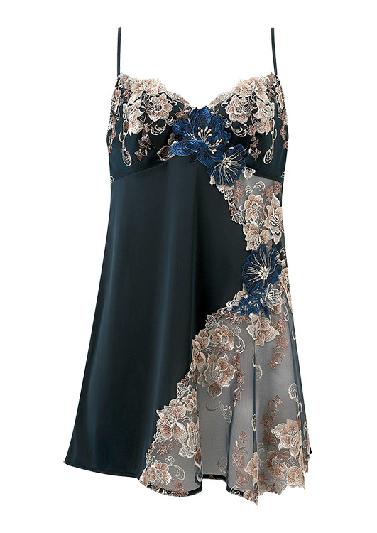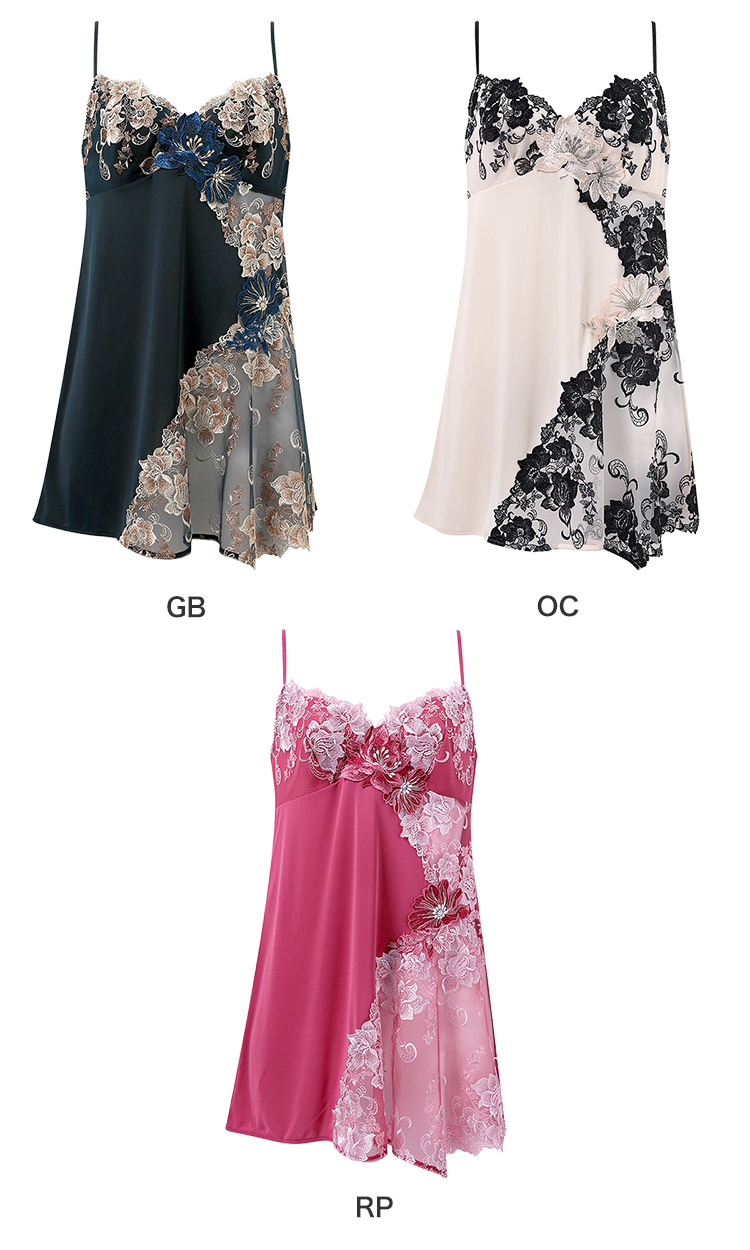 雰囲気の異なる2つの素材を大胆に切り替えた、斬新でゴージャスなロングキャミソール。はっきりとした輪郭で表現された花々が独創的な魅力を際立たせます。芍薬の花をイメージした胸もとのアップリケにクリスタルを添えて特別感を演出。バックスタイルは背中を美しく魅せるセクシーなデザインに仕上げました。