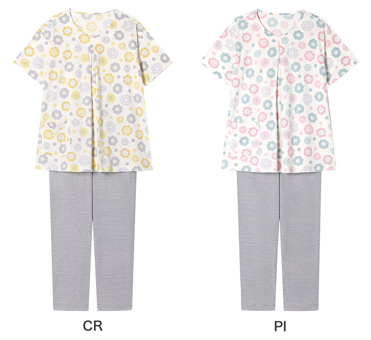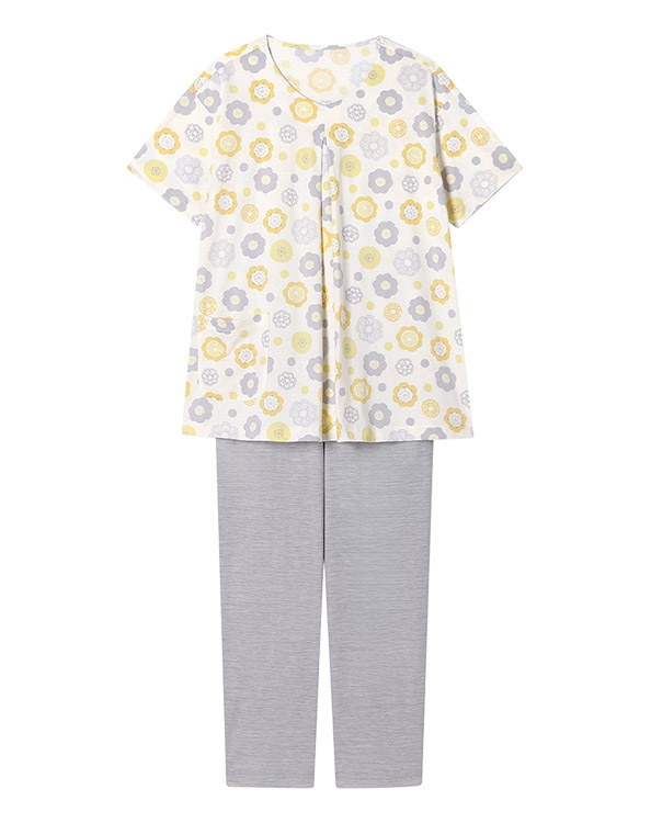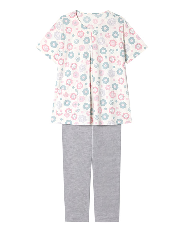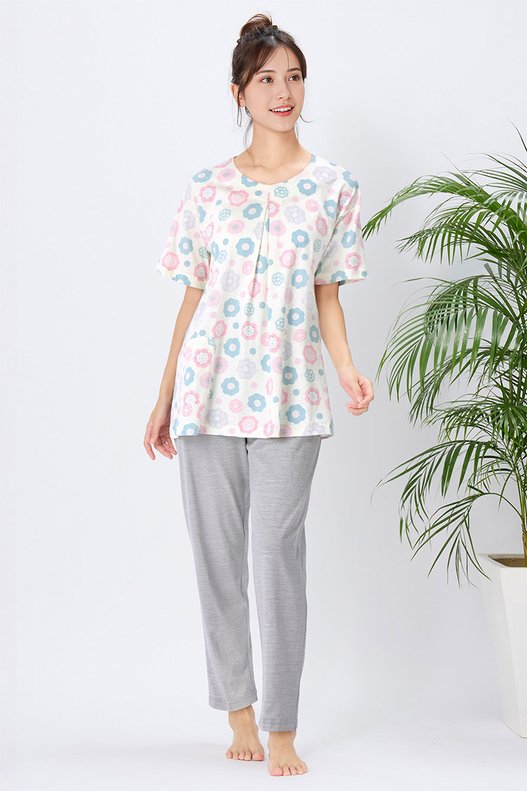 ●トップスはまるくかわいらしい花柄のプリントで、ボトムは杢調プリントの組み合わせ
