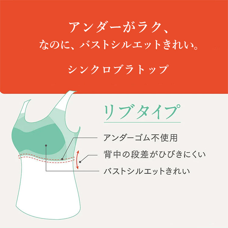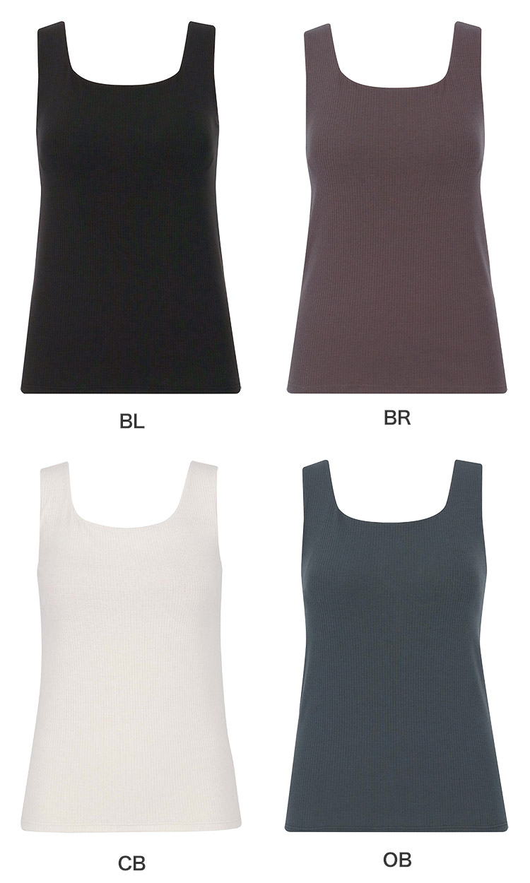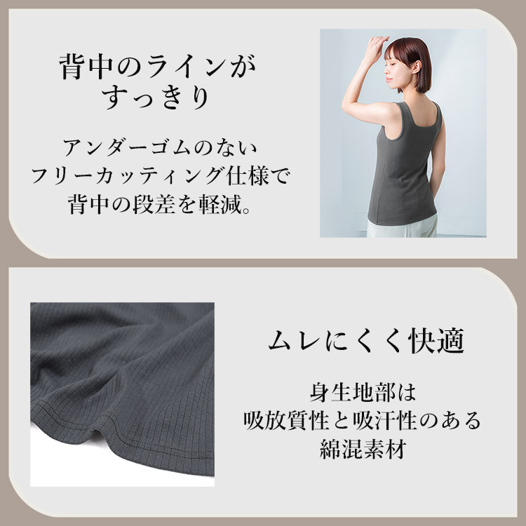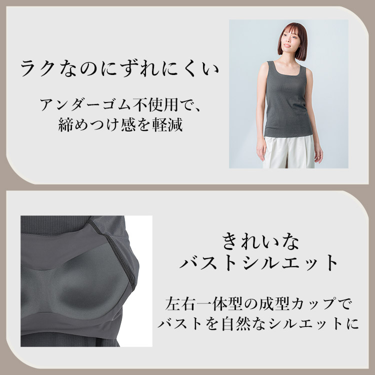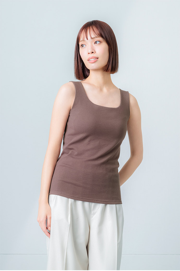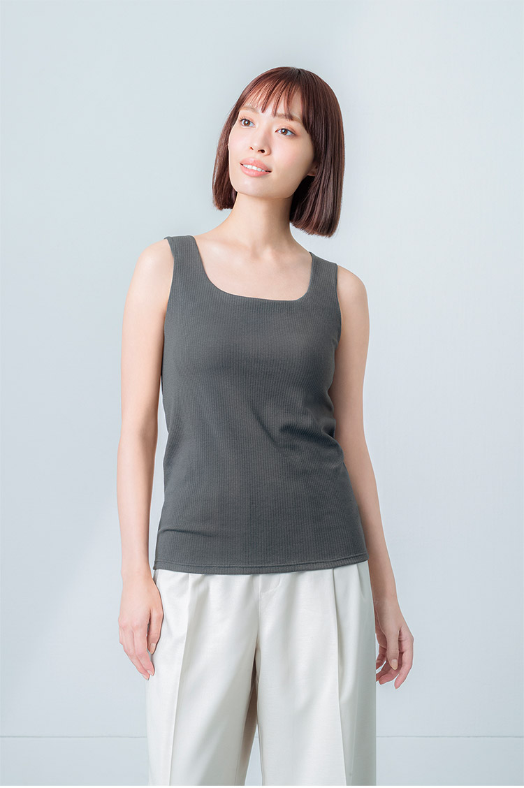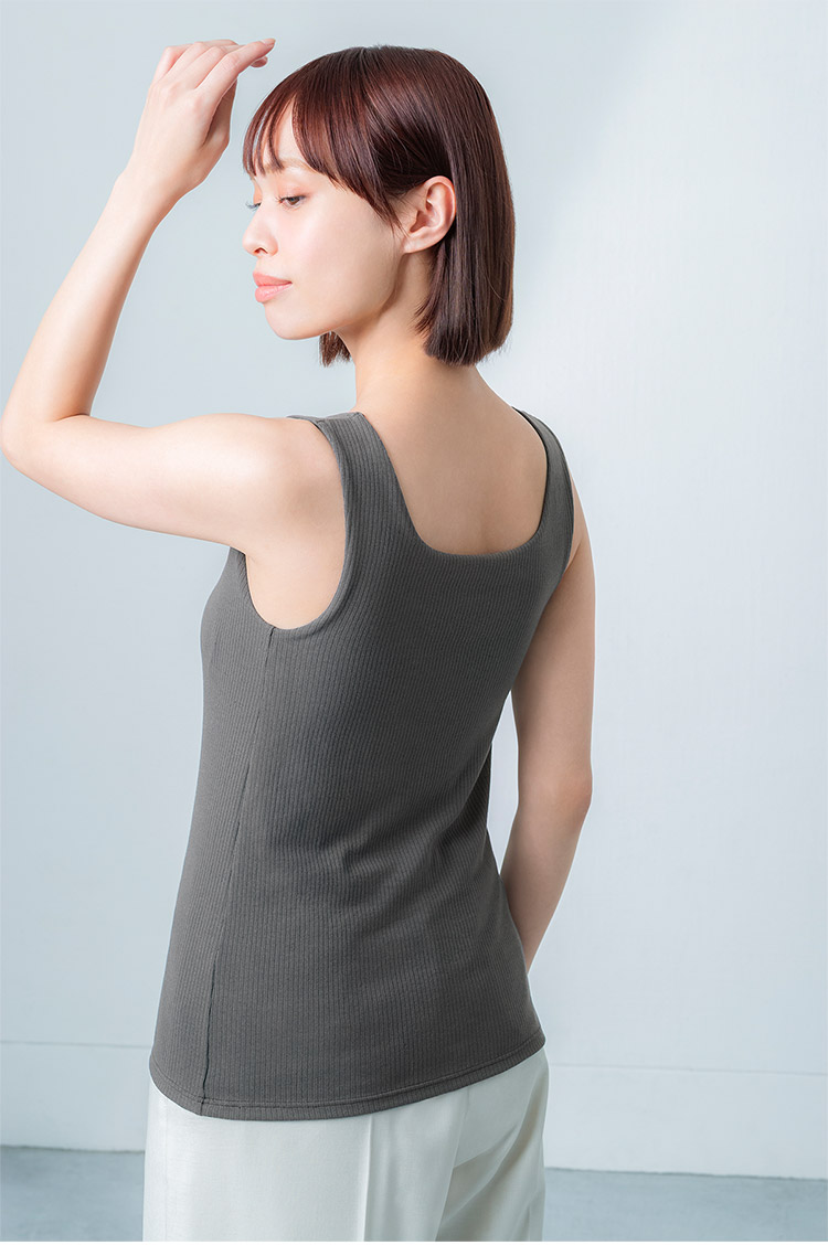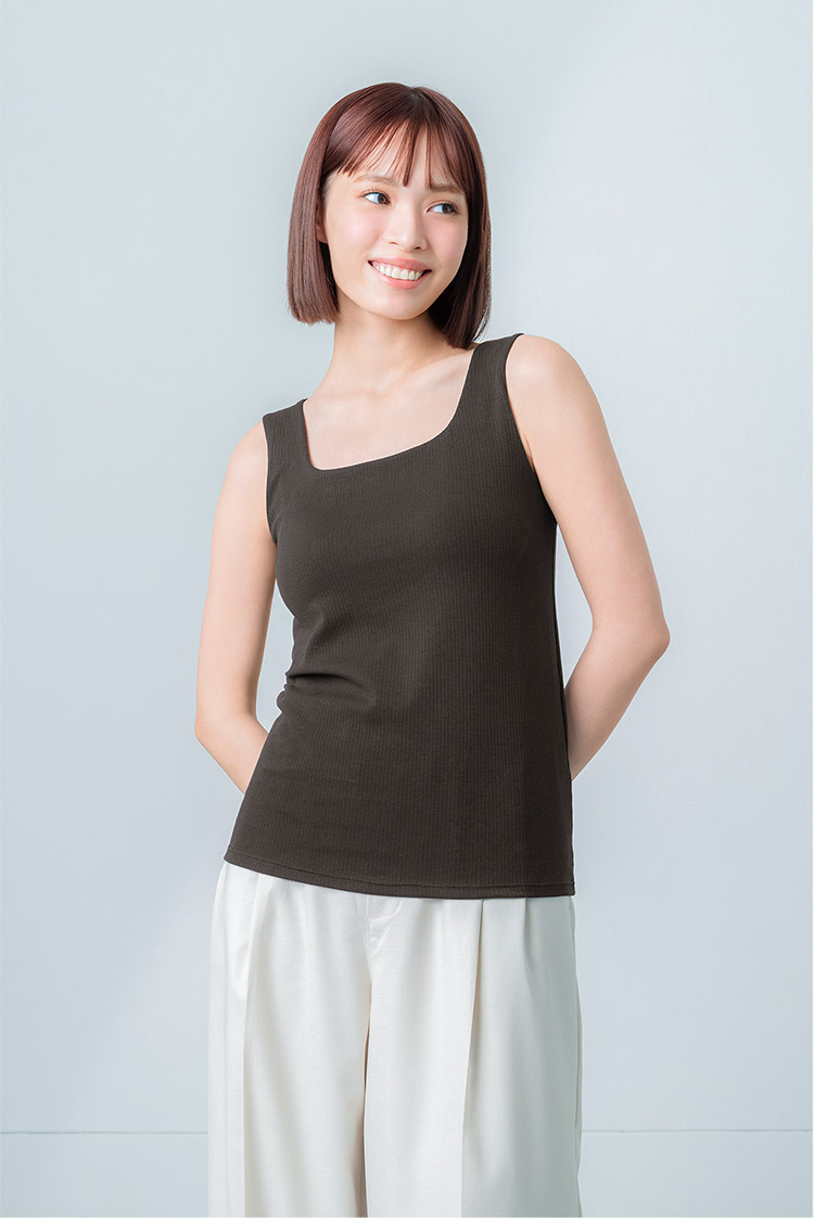 ブラトップでラクしたい日のお出かけにもぴったりなリブ素材で、高めに設定したスクエアネックや広めの身幅、ネック・アームホールの袋縫い仕様など洋服感覚でアウターライクな着こなしが楽しめるこだわりの設計です。