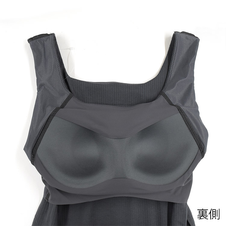 バスト部分はアンダーゴムがなく、しめつけ感を軽減。しかもズレ上がりにくい。カップ部分をのぞくアンダーバスト部分、背中部分の裏打ちに吸汗速乾素材を使用