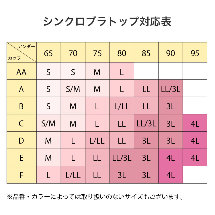 M (トップバスト79-87cm)、L (トップバスト86-94cm)、LL (トップバスト93-101cm)