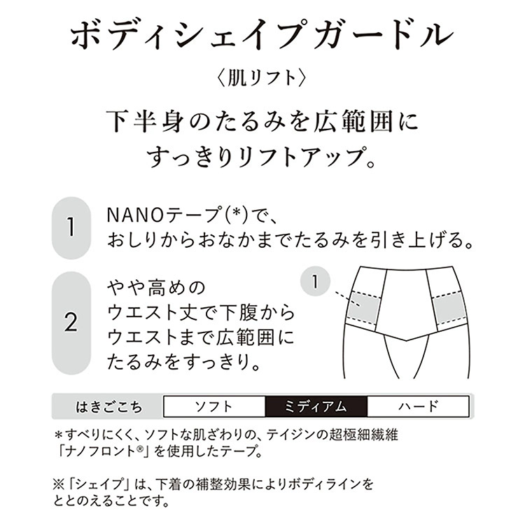 ※フィッティング時は「NANOテープ」部分を下から沿わせながら引き上げてください。その際引き上げすぎないことと、通常行う「手直し」(着用後、ボトムの中に手を入れてととのえること)をしないようにお願いします(手直しするとリフトアップ効果が薄れます)