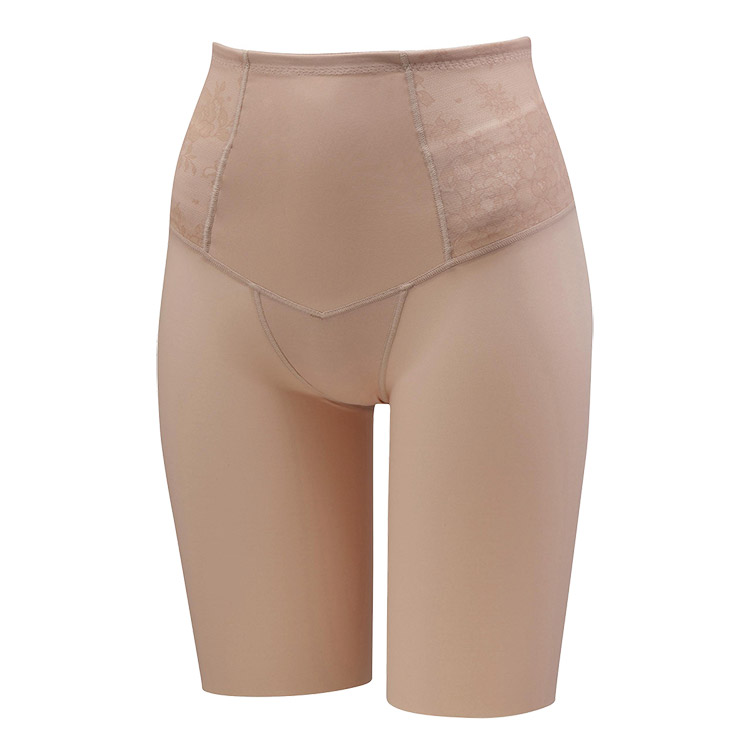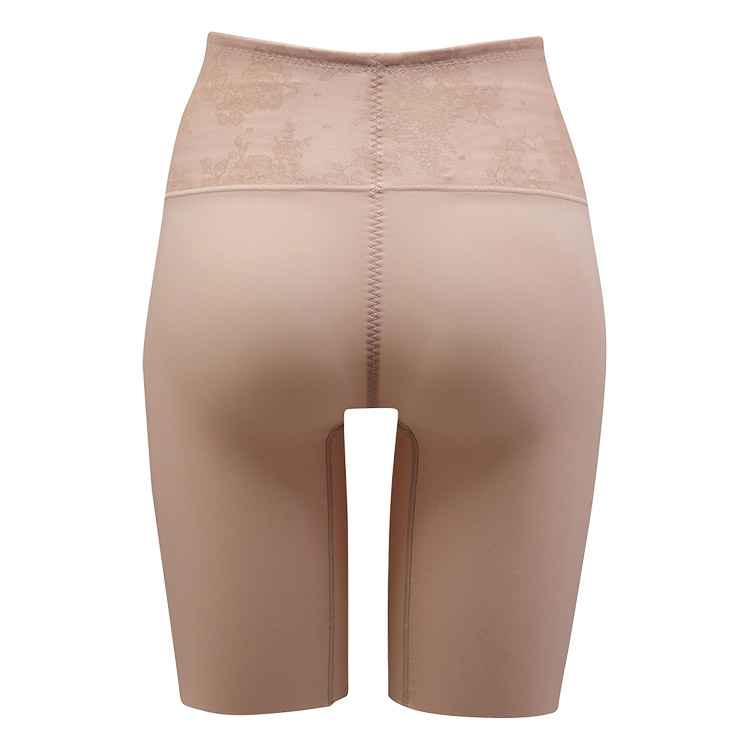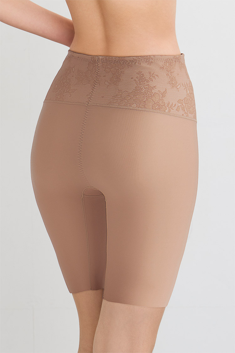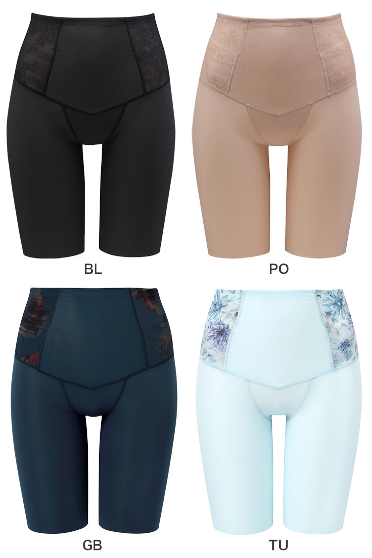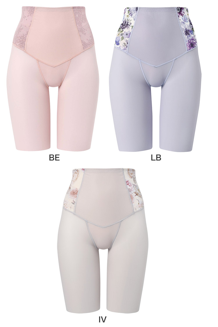はきこみ丈を通常のジャストウエストより高めの丈にすることで、ふとももからおなか、ふとももからヒップのリフトアップ効果を高め、よりスリムなシルエットを追求。さらにヒップ下はパワー切り替えのない素材で、たるみをぴったり包み、美しいシルエットをキープ