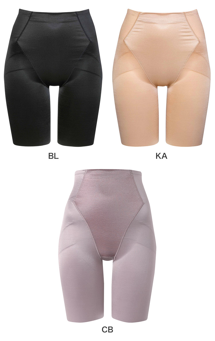 伸びの止まる裏打ちで、脇腹・下腹をシェイプ。前ウエストはゴムを使わない折り返し始末で、くいこみにくい